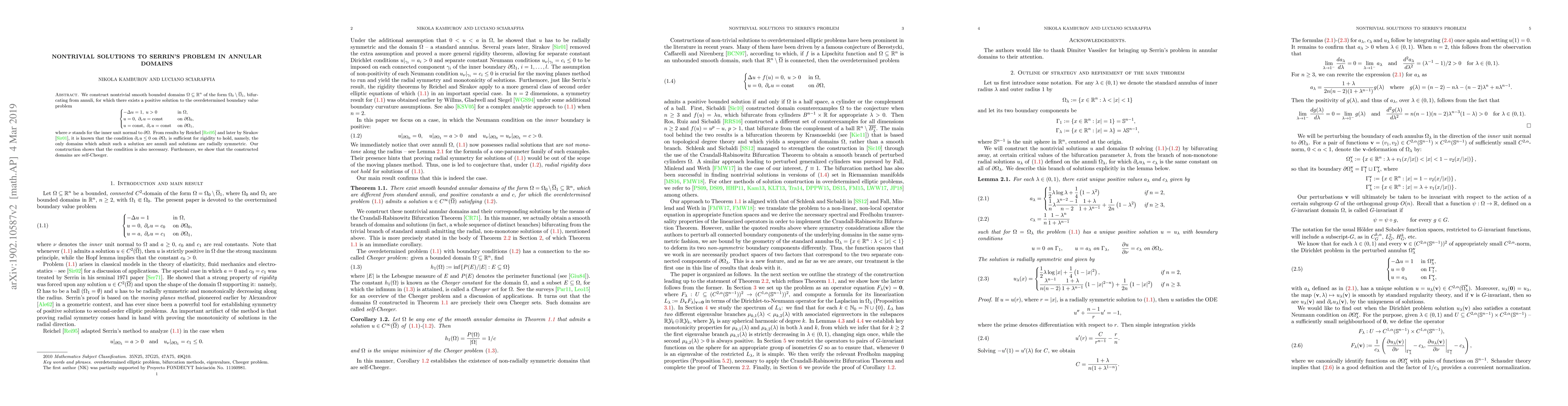 We construct nontrivial smooth bounded domains $\Omega \subseteq \mathbb{R}^n$ of the form $\Omega_0 \setminus \overline{\Omega}_1$, bifurcating from annuli, for which there exists a positive solution to the overdetermined boundary value problem \[ -\Delta u = 1, \; u>0 \quad \text{in } \Omega, \qquad u = 0 ,\; \partial_\nu u = \text{const} \quad \text{on } \partial\Omega_0, \qquad u = \text{const} ,\; \partial_\nu u = \text{const} \quad \text{on } \partial \Omega_1, \] where $\nu$ stands for the inner unit normal to $\partial\Omega$. From results by Reichel and later by Sirakov, it was known that the condition $\partial_\nu u \leq 0$ on $\partial\Omega_1$ is sufficient for rigidity to hold, namely, the only domains which admit such a solution are annuli and solutions are radially symmetric. Our construction shows that the condition is also necessary. In addition, the constructed domains are shown to be self-Cheeger.