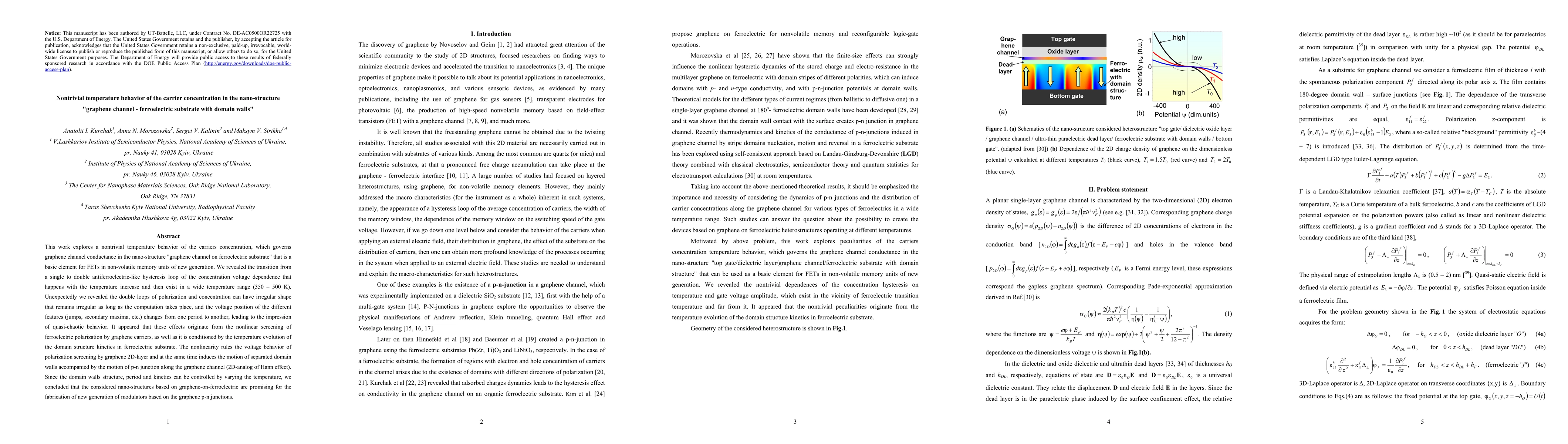 This work explores a nontrivial temperature behavior of the carriers concentration, which governs graphene channel conductance in the nano-structure "graphene channel on ferroelectric substrate" that is a basic element for FETs in non-volatile memory units of new generation. We revealed the transition from a single to double antiferroelectric-like hysteresis loop of the concentration voltage dependence that happens with the temperature increase and then exist in a wide temperature range (from 350 to 500 K). Unexpectedly we revealed the double loops of polarization and concentration can have irregular shape that remains irregular as long as the computation takes place, and the voltage position of the different features (jumps, secondary maxima, etc.) changes from one period to another, leading to the impression of quasi-chaotic behavior. It appeared that these effects originate from the nonlinear screening of ferroelectric polarization by graphene carriers, as well as it is conditioned by the temperature evolution of the domain structure kinetics in ferroelectric substrate. The nonlinearity rules the voltage behavior of polarization screening by graphene 2D-layer and at the same time induces the motion of separated domain walls accompanied by the motion of p-n junction along the graphene channel (2D-analog of Hann effect). Since the domain walls structure, period and kinetics can be controlled by varying the temperature, we concluded that the considered nano-structures based on graphene-on-ferroelectric are promising for the fabrication of new generation of modulators based on the graphene p-n junctions.