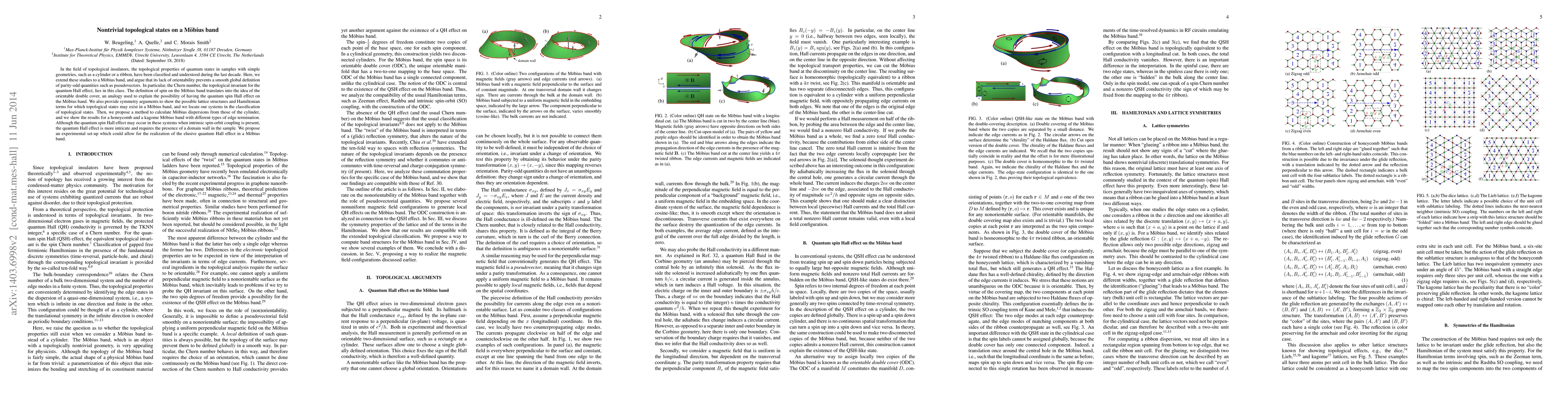 This paper explores nontrivial topological states on a Möbius band, demonstrating that its unique geometry impacts the definition of parity-odd quantities and the existence of quantum spin Hall effects. It proposes methods to calculate dispersions and discusses the conditions for observing quantum Hall effects, suggesting an experimental setup for their realization.