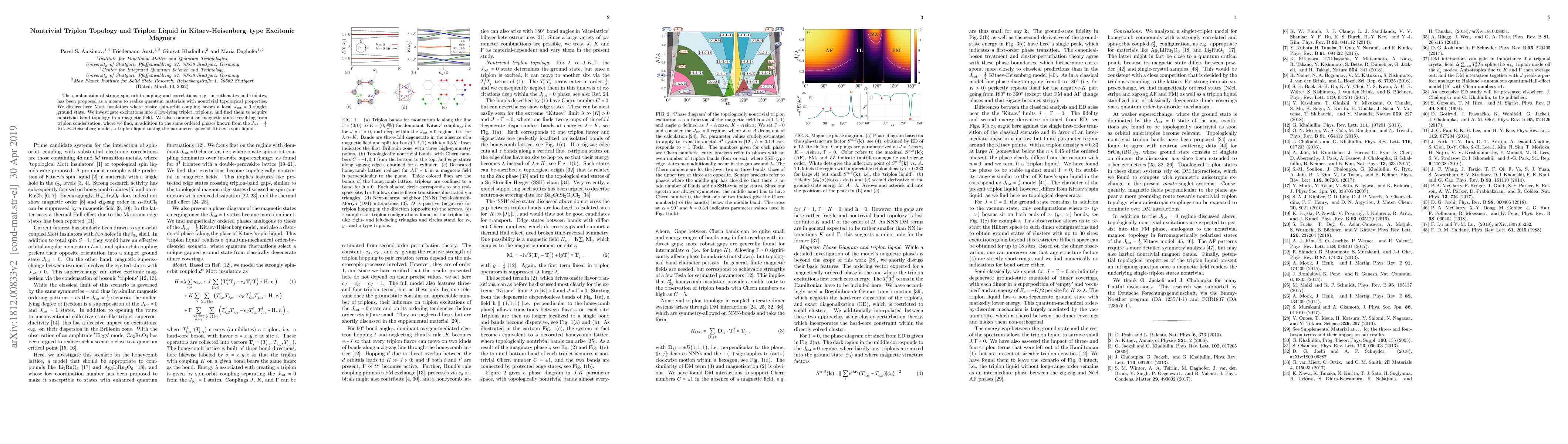 This paper explores the topological properties of triplons in Kitaev-Heisenberg-type excitonic magnets, revealing nontrivial band topology under a magnetic field and identifying a triplon liquid phase alongside conventional magnetic states.