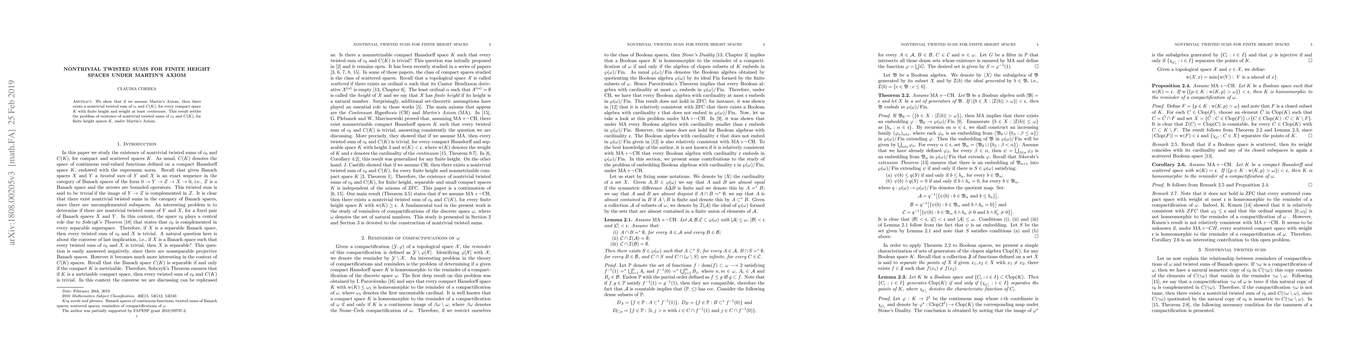 This paper demonstrates that under Martin's Axiom, there exists a nontrivial twisted sum of c_0 and C(K) for any compact space K with finite height and weight at least continuum, resolving the existence question for such twisted sums in finite height spaces.
