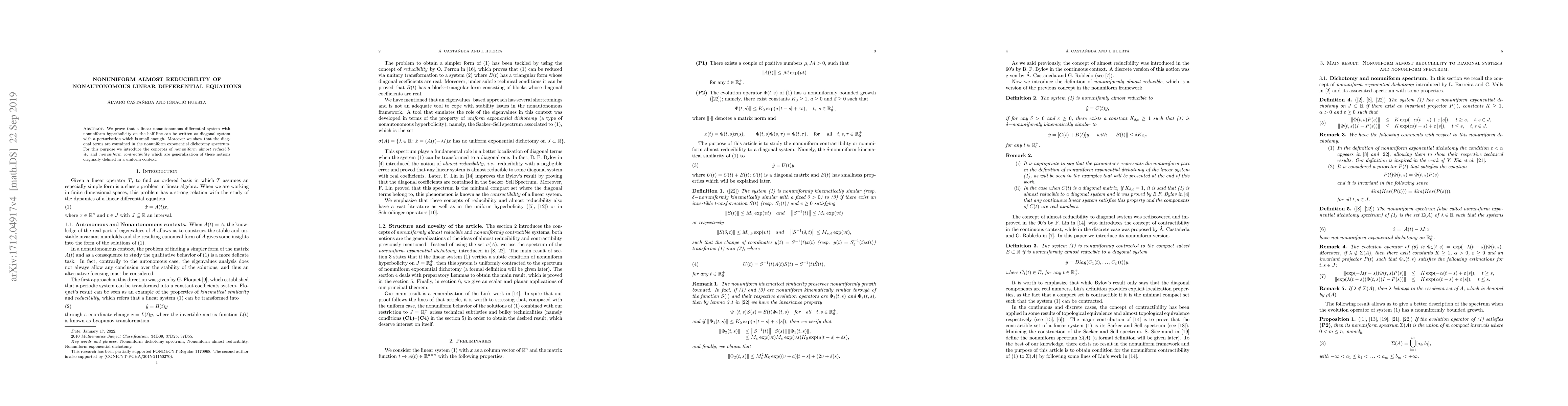 We prove that a linear nonautonomous differential system with nonuniform hyperbolicity on the half line can be expressed as diagonal system with a perturbation which is small enough. Moreover we show that the diagonal terms are contained in the nonuniform exponential dichotomy spectrum. For this purpose we introduce the concepts of \textit{nonuniform almost reducibility} and \textit{nonuniform contractibility} which are generalization of this notions originally defined in a uniform context.