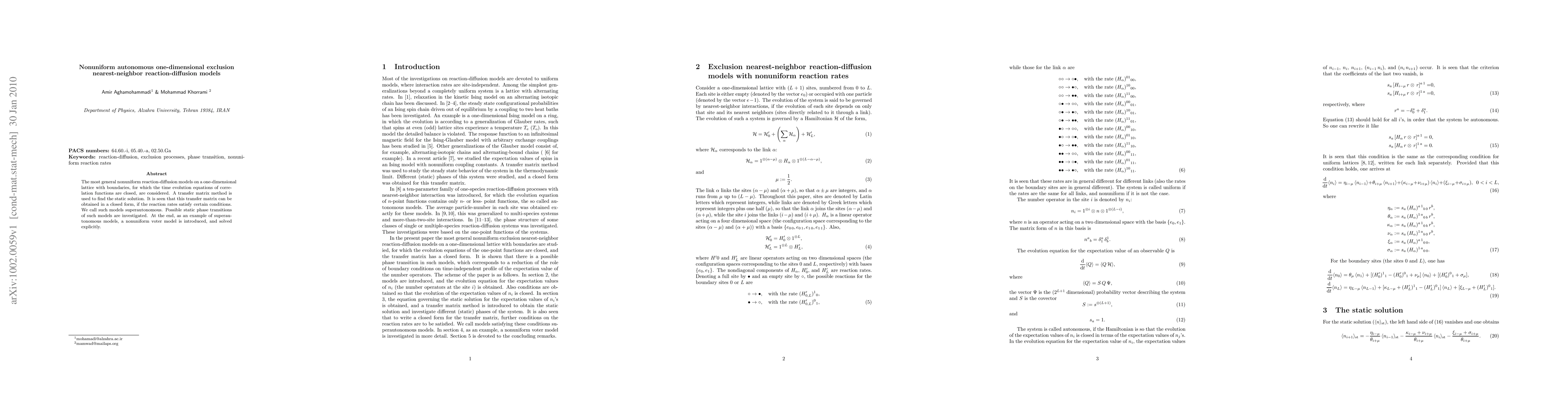 This paper explores nonuniform reaction-diffusion models on a one-dimensional lattice, employing a transfer matrix method to derive closed-form static solutions under specific conditions termed "superautonomous." It investigates potential static phase transitions and exemplifies with a solved nonuniform voter model.
