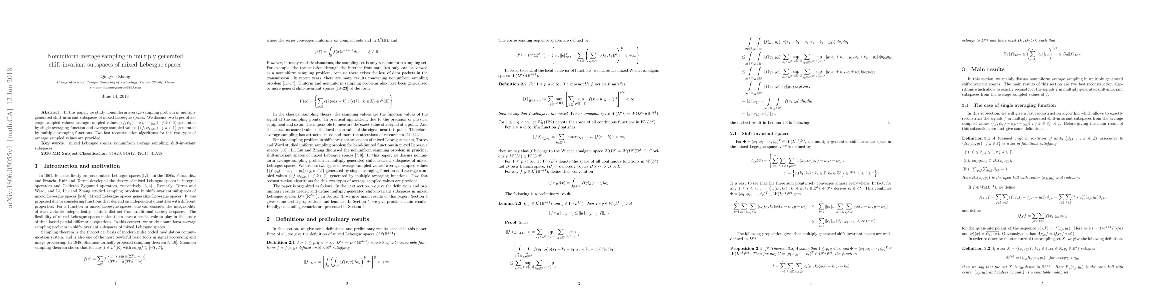 This paper investigates nonuniform average sampling in shift-invariant subspaces of mixed Lebesgue spaces, focusing on two types of average sampled values and presenting two corresponding fast reconstruction algorithms.