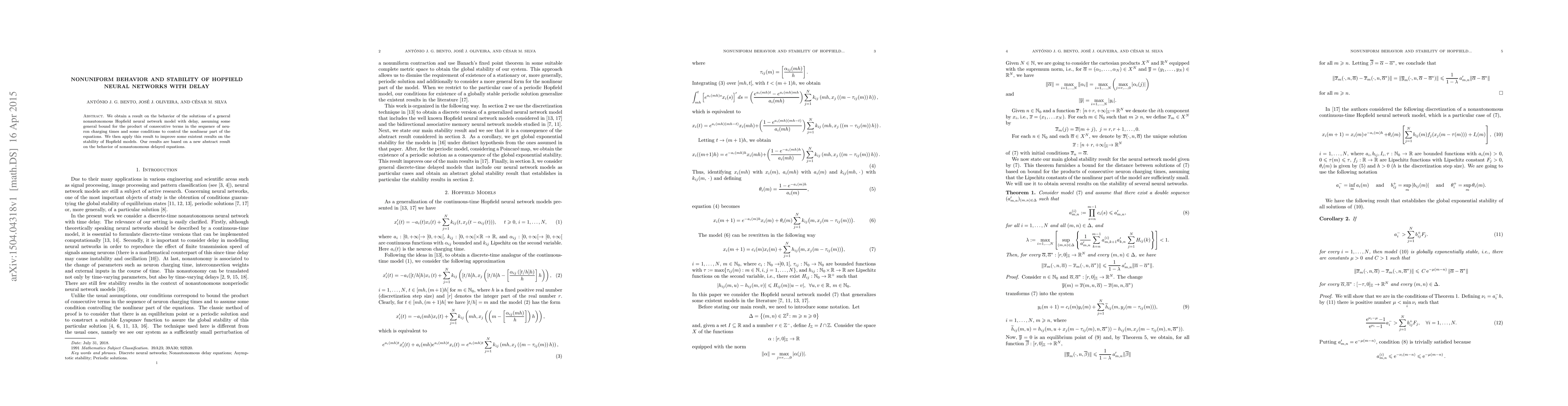 This paper investigates the stability and behavior of nonuniform Hopfield neural networks with delays, establishing new results based on a general bound for neuron charging times and conditions for the nonlinear components. It improves existing stability results for Hopfield models using an abstract result on nonautonomous delayed equations.