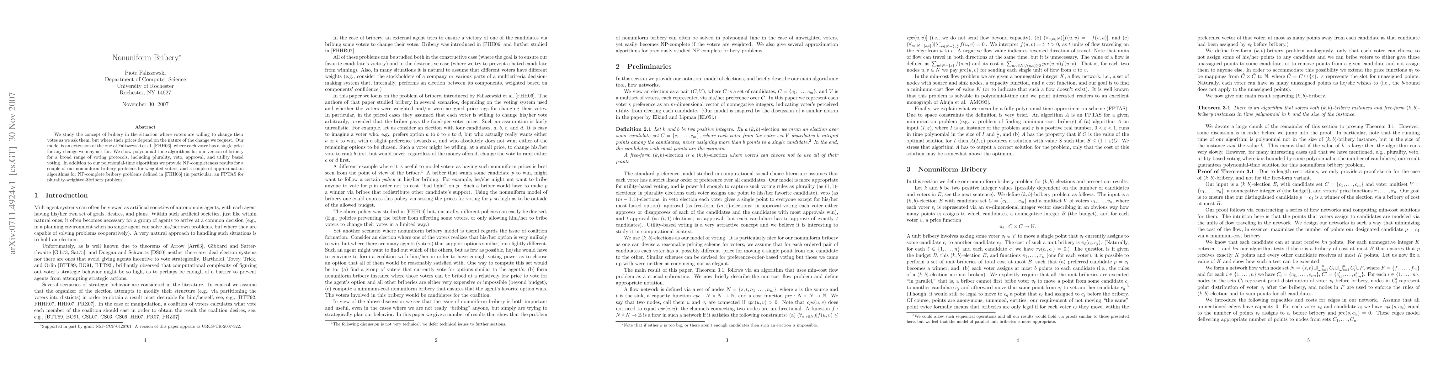 This paper explores a nonuniform bribery model where voters have varying prices for different vote changes, extending the uniform bribery model. It presents polynomial-time algorithms for several voting protocols and NP-completeness results for weighted voters, along with an FPTAS for the plurality-weighted bribery problem.