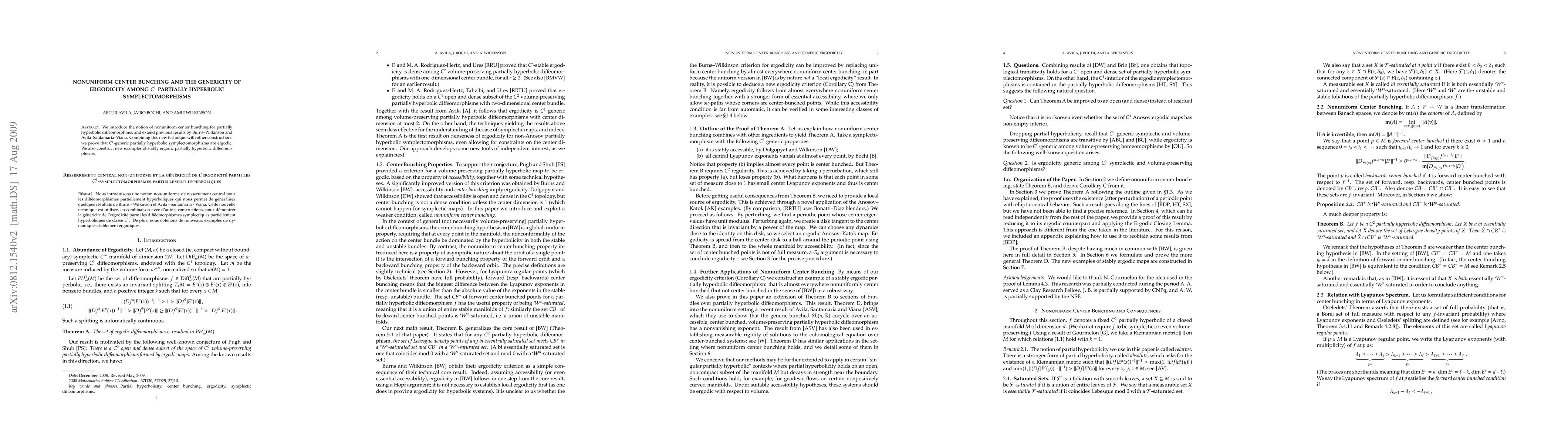 We introduce the notion of nonuniform center bunching for partially hyperbolic diffeomorphims, and extend previous results by Burns--Wilkinson and Avila--Santamaria--Viana. Combining this new technique with other constructions, we prove that $C^1$-generic partially hyperbolic symplectomorphisms are ergodic. We also construct new examples of stably ergodic partially hyperbolic diffeomorphisms.