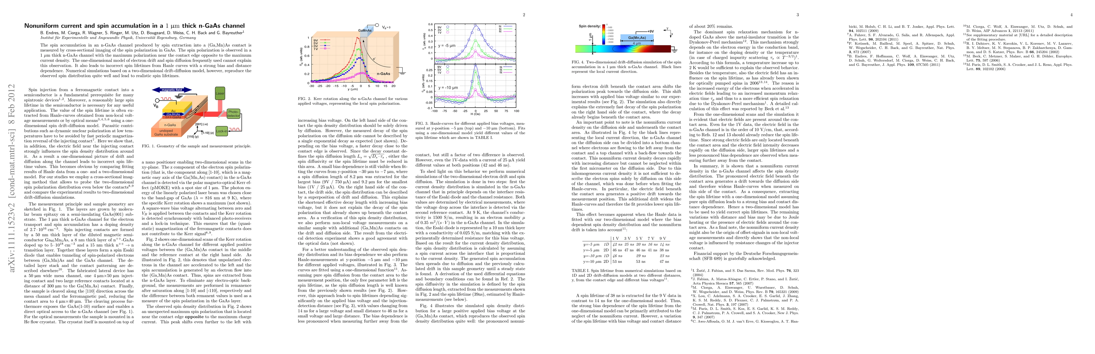 This paper investigates spin accumulation in a 1 μm thick n-GaAs channel using cross-sectional imaging, revealing nonuniform current density effects. Numerical simulations based on a two-dimensional drift-diffusion model better explain the observed spin polarization than the traditional one-dimensional model.
