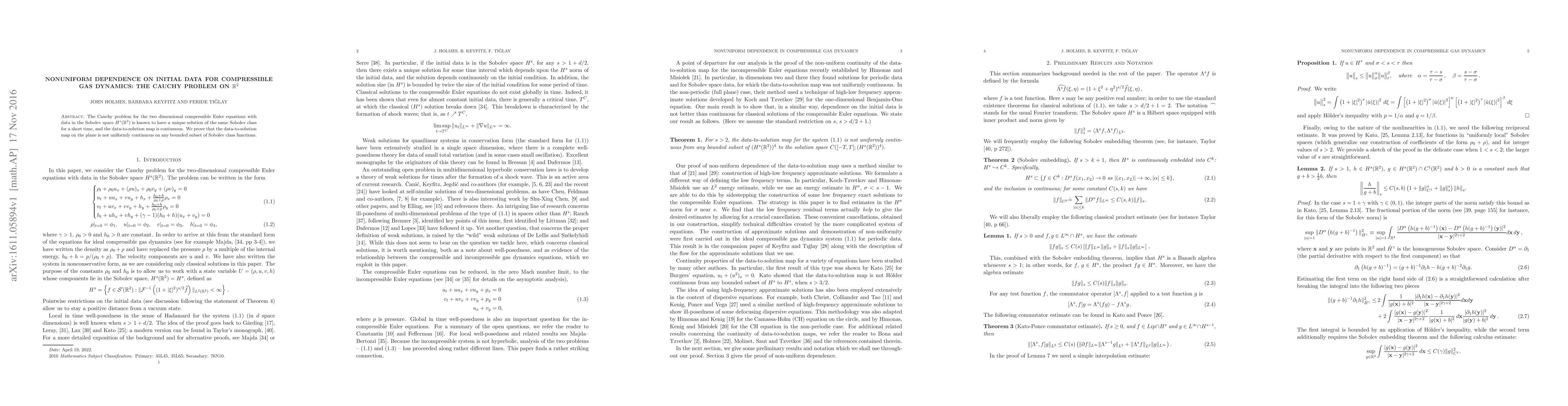 The study shows that small changes in initial data lead to drastically different solutions for compressible gas dynamics equations, indicating nonuniform continuity of the data-to-solution map.
