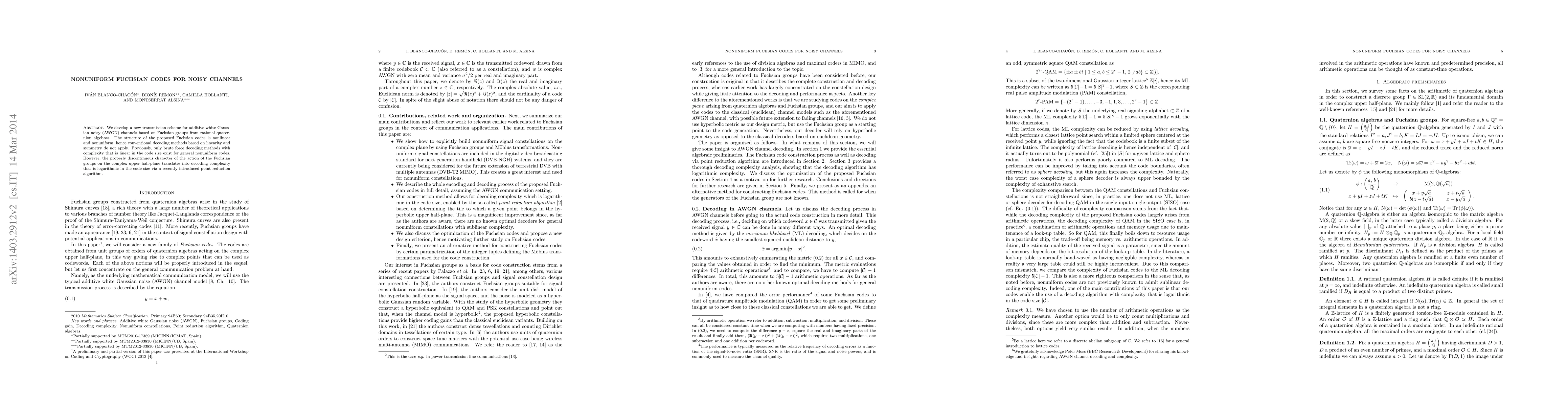 We develop a new transmission scheme for additive white Gaussian noisy (AWGN) channels based on Fuchsian groups from rational quaternion algebras. The structure of the proposed Fuchsian codes is nonlinear and nonuniform, hence conventional decoding methods based on linearity and symmetry do not apply. Previously, only brute force decoding methods with complexity that is linear in the code size exist for general nonuniform codes. However, the properly discontinuous character of the action of the Fuchsian groups on the complex upper half-plane translates into decoding complexity that is logarithmic in the code size via a recently introduced point reduction algorithm.