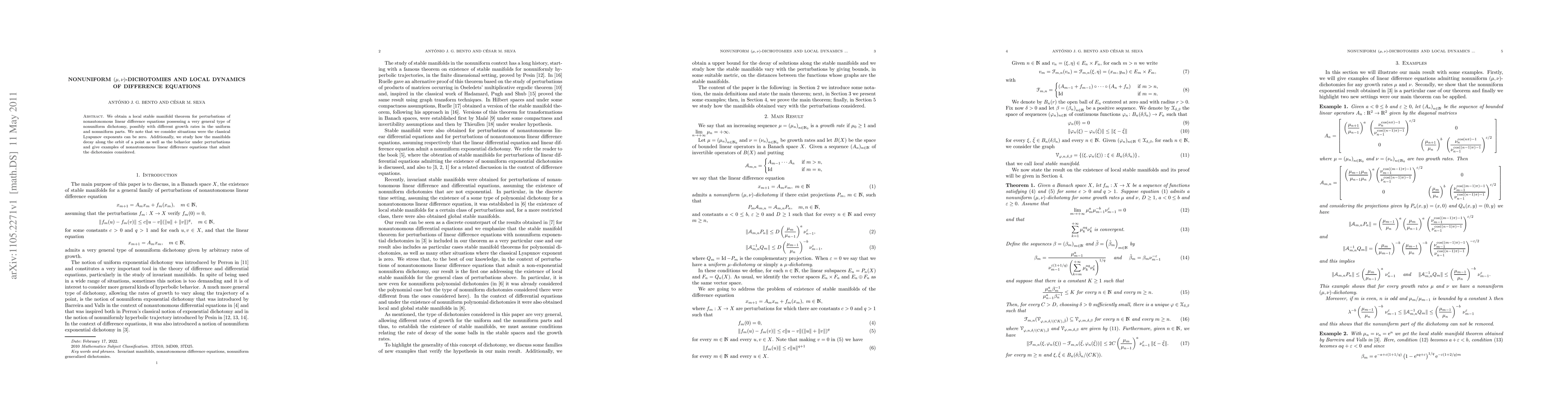 This paper establishes a local stable manifold theorem for nonautonomous linear difference equations with nonuniform $(\mu, \nu)$-dichotomies, allowing for different growth rates and zero classical Lyapunov exponents. It also examines the decay of manifolds along orbits and their behavior under perturbations, providing relevant examples.