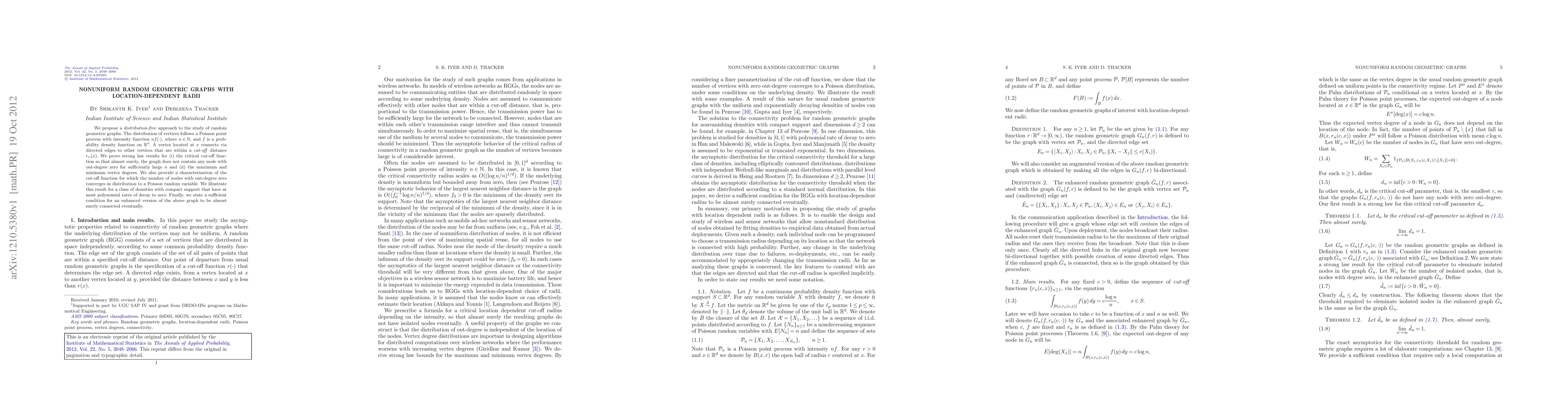 We propose a distribution-free approach to the study of random geometric graphs. The distribution of vertices follows a Poisson point process with intensity function $nf(\cdot)$, where $n\in \mathbb{N}$, and $f$ is a probability density function on $\mathbb{R}^d$. A vertex located at $x$ connects via directed edges to other vertices that are within a cut-off distance $r_n(x)$. We prove strong law results for (i) the critical cut-off function so that almost surely, the graph does not contain any node with out-degree zero for sufficiently large $n$ and (ii) the maximum and minimum vertex degrees. We also provide a characterization of the cut-off function for which the number of nodes with out-degree zero converges in distribution to a Poisson random variable. We illustrate this result for a class of densities with compact support that have at most polynomial rates of decay to zero. Finally, we state a sufficient condition for an enhanced version of the above graph to be almost surely connected eventually.