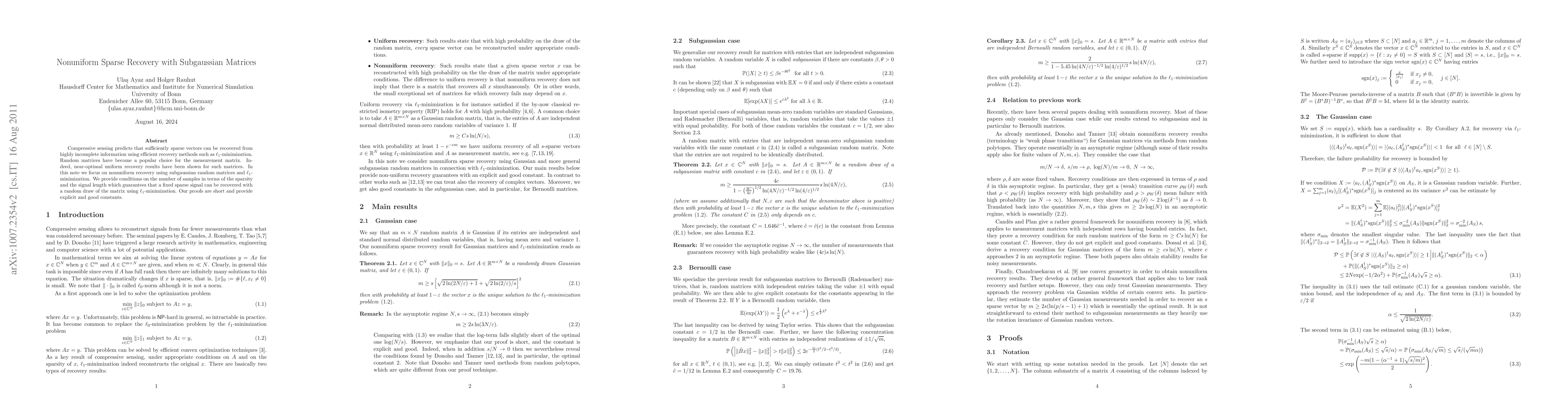 This paper investigates nonuniform sparse recovery using Gaussian random matrices and $\ell_1$-minimization, providing a condition on the number of samples that guarantees recovery of a fixed sparse signal. The optimal constant in the condition is shown to be 2, with a concise proof.