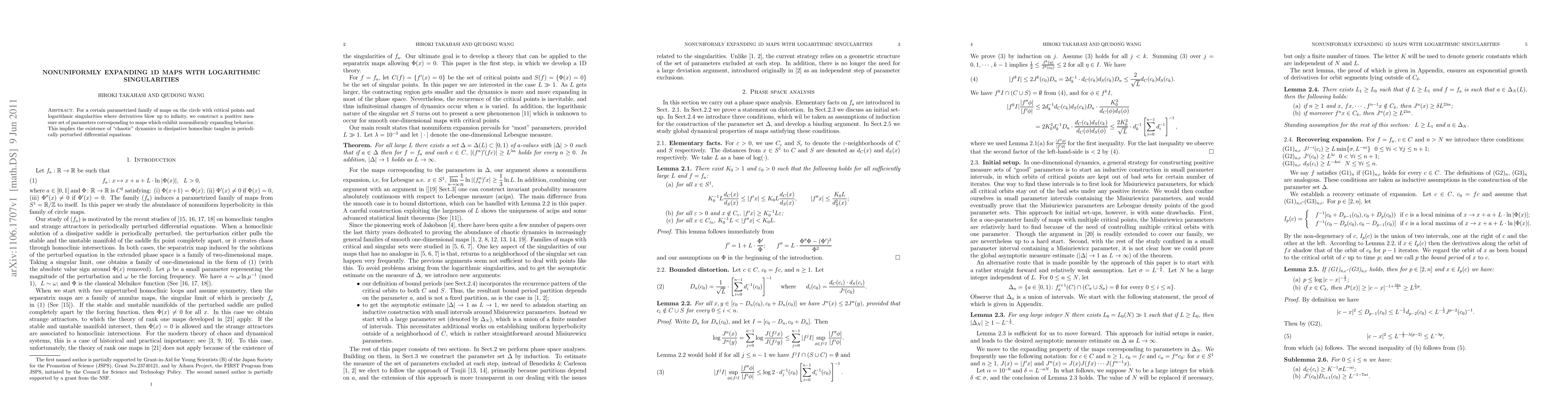 This paper constructs a positive measure set of parameters for a family of 1D maps on the circle with logarithmic singularities, demonstrating nonuniformly expanding behavior and chaotic dynamics in dissipative homoclinic tangles of periodically perturbed differential equations.