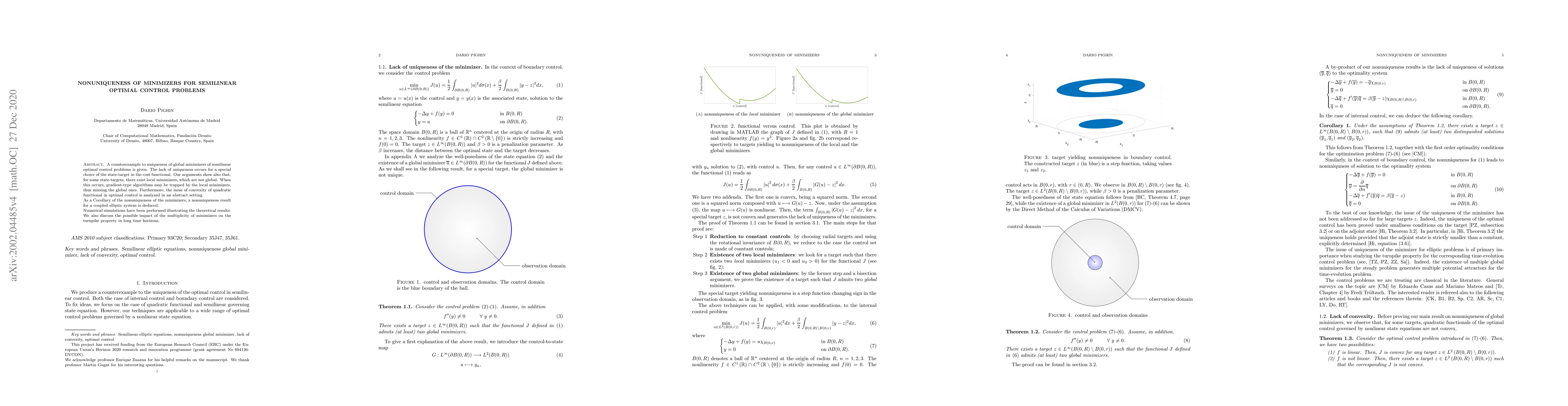 This paper presents a counterexample demonstrating the nonuniqueness of global minimizers in semilinear optimal control problems, particularly when specific state-targets are chosen. It also highlights the potential for gradient-type algorithms to converge to local rather than global minimizers, and discusses implications for the convexity of quadratic functionals in optimal control.