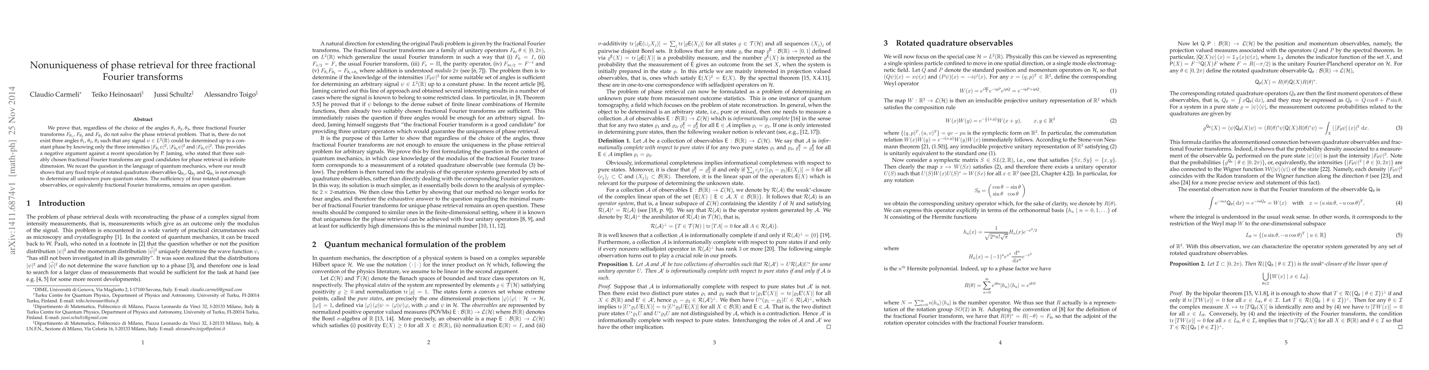 This paper demonstrates that three fractional Fourier transforms cannot solve the phase retrieval problem, refuting a recent claim by P. Jaming. It also shows that a fixed triple of rotated quadrature observables in quantum mechanics is insufficient to determine all pure quantum states, leaving the sufficiency of four such observables as an open question.