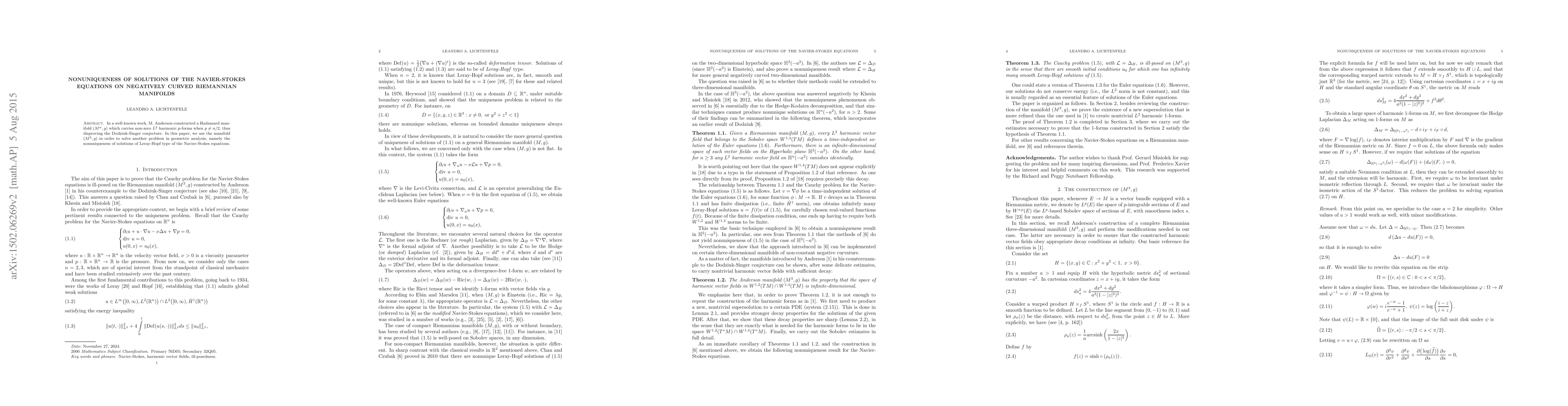 In a well-known work, M. Anderson constructed a Hadamard manifold $(M^n, g)$ which carries non-zero $L^2$ harmonic $p$-forms when $p \neq n/2$, thus disproving the Dodziuk-Singer conjecture. In this paper, we use the manifold $(M^3, g)$ in order to solve another problem in geometric analysis, namely the nonuniqueness of solutions of Leray-Hopf type of the Navier-Stokes equations.