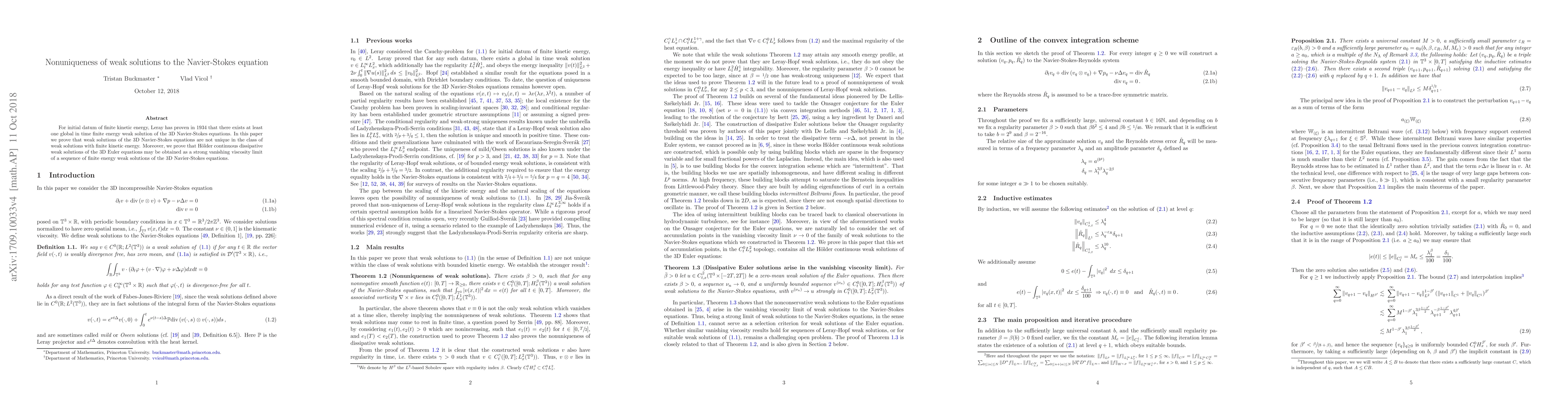 This paper demonstrates that weak solutions to the 3D Navier-Stokes equations are not unique among those with finite kinetic energy. It also shows that Holder continuous dissipative weak solutions of the 3D Euler equations can be derived by taking the strong vanishing viscosity limit of a sequence of finite energy weak solutions of the Navier-Stokes equations.