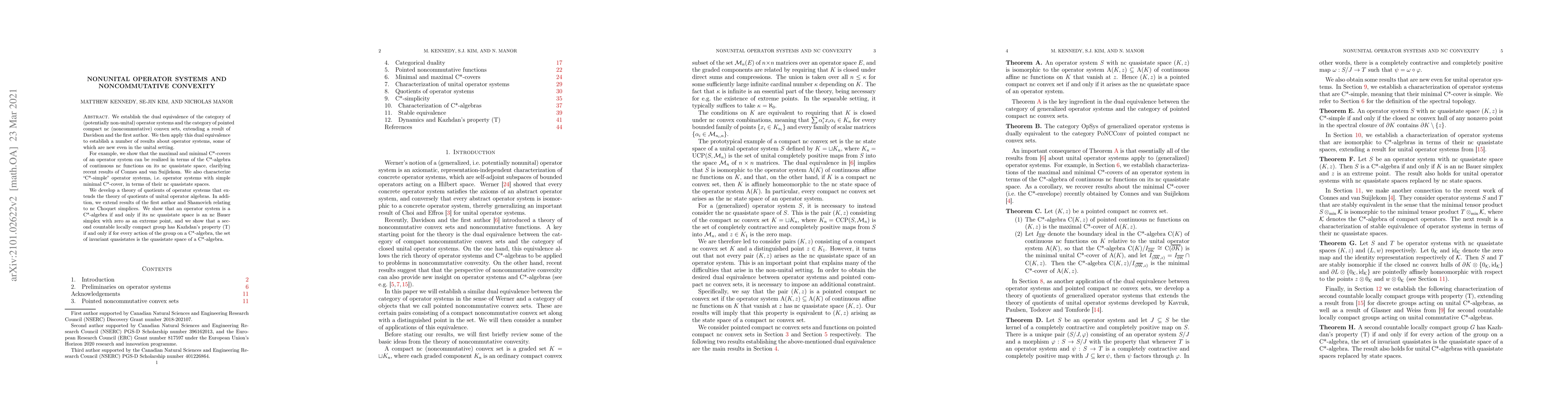 The paper establishes a dual equivalence between nonunital operator systems and pointed compact nc convex sets, revealing new insights into maximal and minimal C*-covers, quotients of operator systems, and the relationship between operator systems and Kazhdan's property (T).