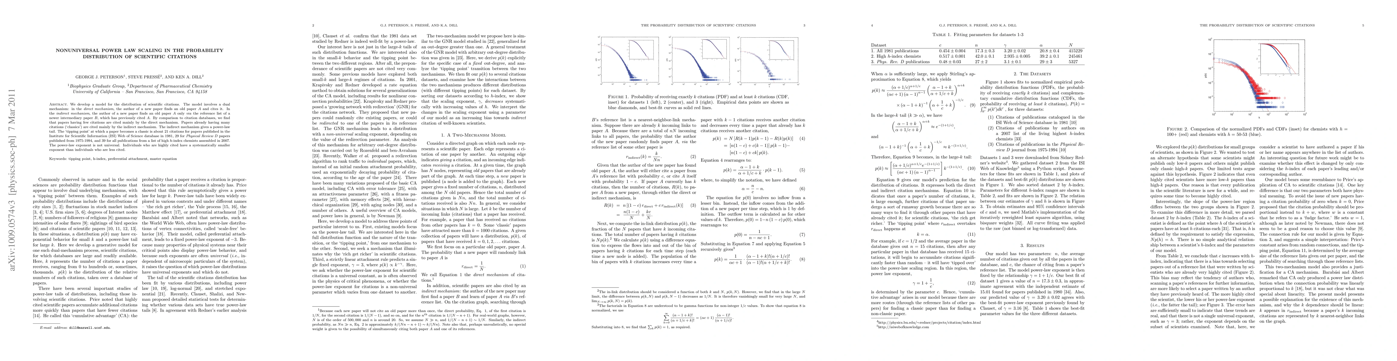 This paper develops a model explaining the nonuniversal power law scaling in scientific citation distribution, showing that papers with few citations are primarily cited directly, while highly cited "classics" are mainly cited indirectly via intermediary papers, leading to a nonuniversal power-law tail. The tipping point for classic status varies across databases and authors, with highly cited individuals exhibiting a smaller power-law exponent.