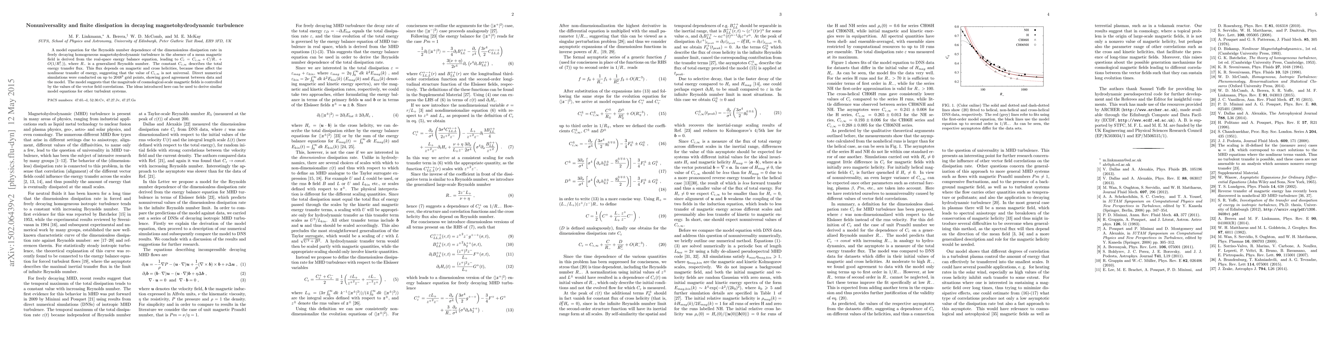 This paper derives a model equation for the Reynolds number dependence of dissipation rate in magnetohydrodynamic turbulence, showing that the total energy transfer flux is not universal and depends on magnetic and cross helicities. Direct numerical simulations validate the model, suggesting that cosmological magnetic field magnitudes are influenced by vector field correlations.