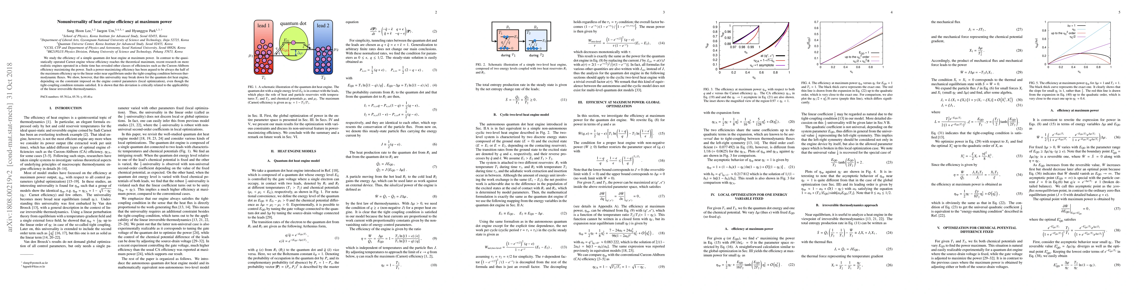 This paper investigates the efficiency of a quantum dot heat engine at maximum power, demonstrating that the universal rule predicting half the maximum efficiency for power-maximizing engines does not always hold. It shows that deviations can occur depending on the specific control parameters, challenging the applicability of linear irreversible thermodynamics.