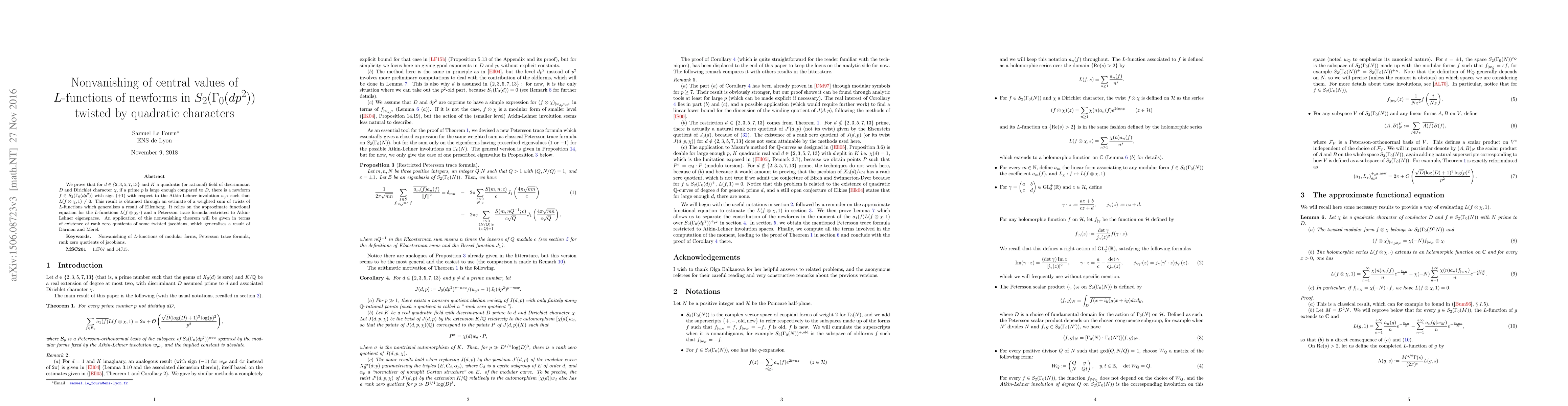 We prove that for $d \in \{ 2,3,5,7,13 \}$ and $K$ a quadratic (or rational) field of discriminant $D$ and Dirichlet character $\chi$, if a prime $p$ is large enough compared to $D$, there is a newform $f \in S_2(\Gamma_0(dp^2))$ with sign $(+1)$ with respect to the Atkin-Lehner involution $w_{p^2}$ such that $L(f \otimes \chi,1) \neq 0$. This result is obtained through an estimate of a weighted sum of twists of $L$-functions which generalises a result of Ellenberg. It relies on the approximate functional equation for the $L$-functions $L(f \otimes \chi, \cdot)$ and a Petersson trace formula restricted to Atkin-Lehner eigenspaces. An application of this nonvanishing theorem will be given in terms of existence of rank zero quotients of some twisted jacobians, which generalises a result of Darmon and Merel.