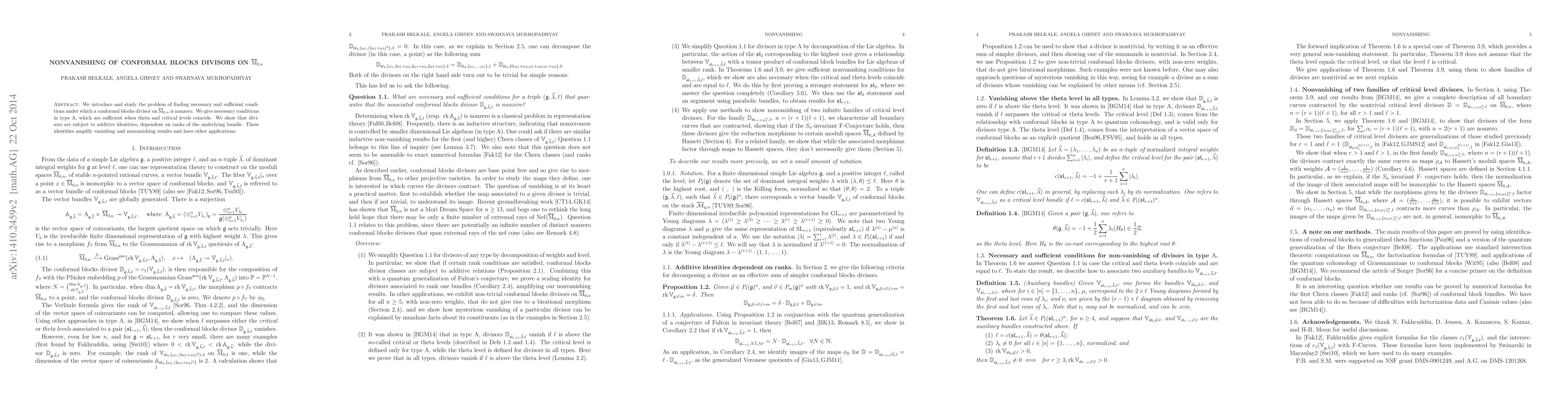 This research explores conditions for the nonvanishing of conformal blocks divisors on $\bar{M}_{0,n}$. It provides necessary conditions in type A and proves that these conditions are sufficient when theta and critical levels coincide, revealing additive identities related to the ranks of underlying bundles.