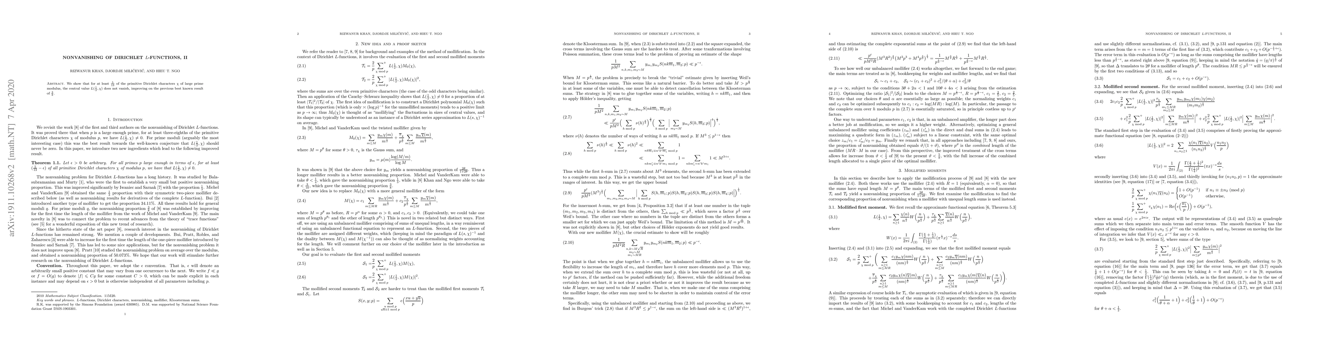 Summary: This paper demonstrates that for at least 5/13 of the primitive Dirichlet characters with large prime moduli, the central value $L(1/2,\chi)$ does not vanish, surpassing the previous best known result of 3/8.
