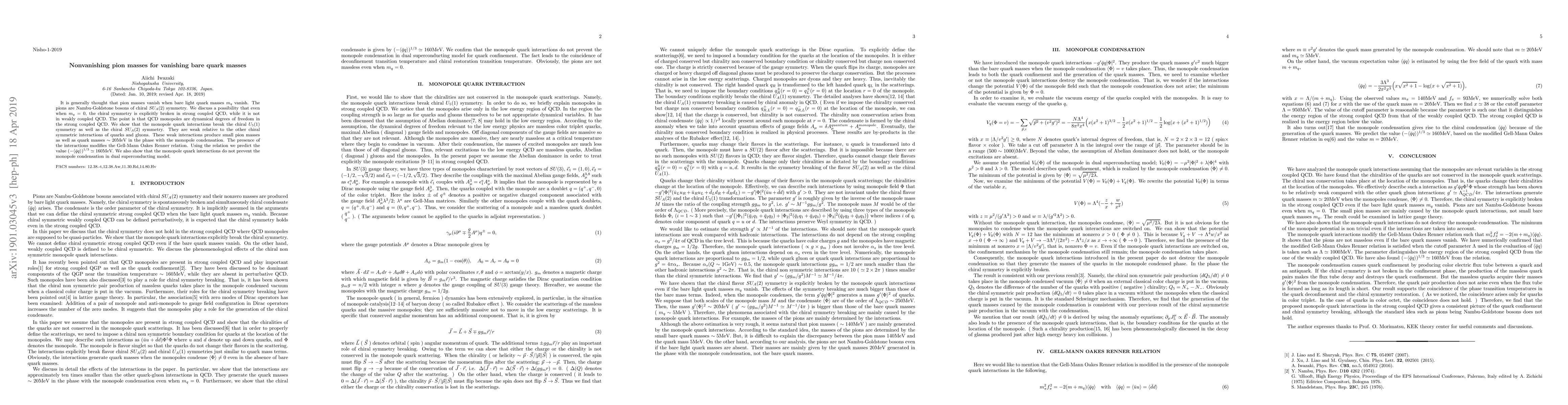 This paper explores the possibility that pion masses do not vanish when bare quark masses $m_q$ are zero due to explicit chiral symmetry breaking in strongly coupled QCD, driven by dynamical QCD monopoles. These monopole interactions produce small pion masses and quark masses around 20 MeV, modifying the Gell-Mann-Okubo-Renner relation and predicting $(-\langle\bar{q}q\rangle)^{1/3}\simeq 160$ MeV.