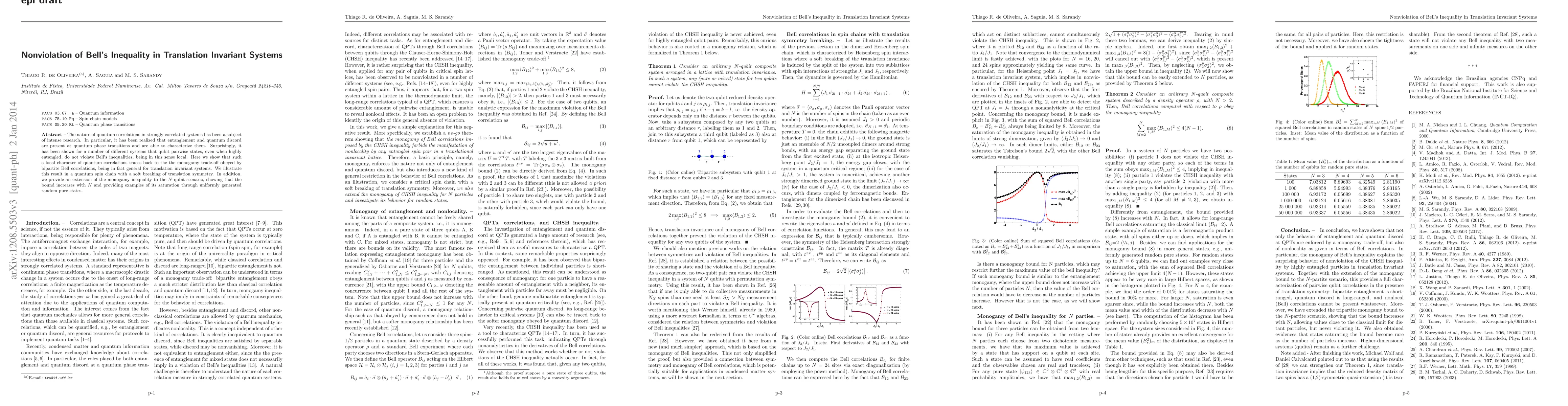 This paper demonstrates that translation invariant quantum systems, despite exhibiting entanglement and quantum discord, do not violate Bell's inequalities due to the monogamy trade-off in tripartite Bell correlations. The study extends the monogamy inequality to $N$-qubit systems, showing that the bound increases with $N$ and providing examples of its saturation.