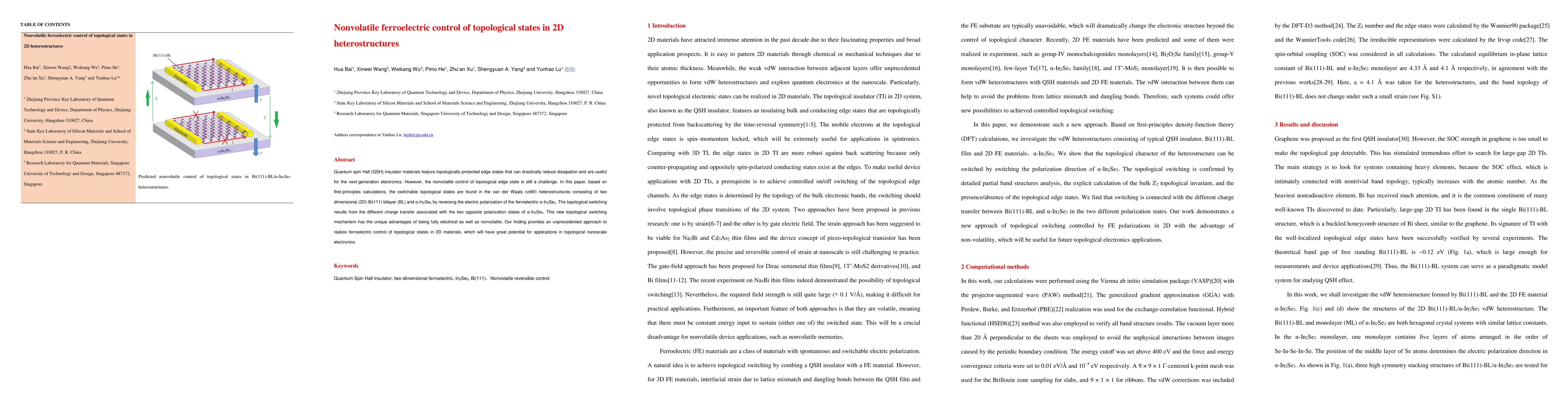 This paper demonstrates a nonvolatile ferroelectric control of topological states in 2D heterostructures using Bi(111) bilayer and α-In2Se3. The topological switching is achieved by reversing the electric polarization of α-In2Se3, offering a fully electrical and nonvolatile method for controlling topological edge states, with potential applications in nanoscale electronics.