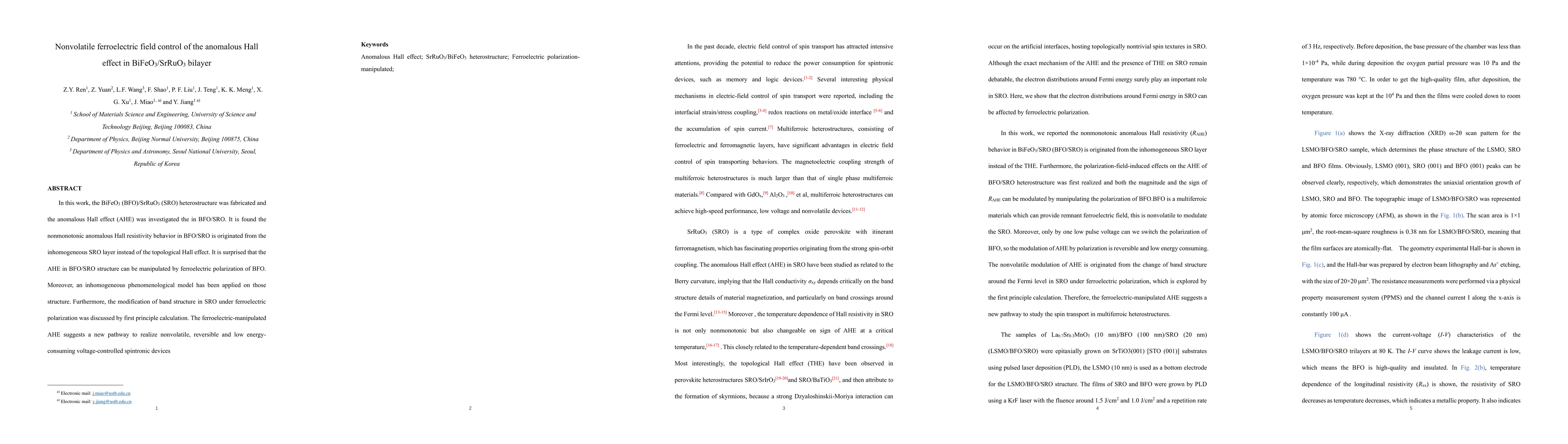 This paper investigates the BiFeO3/SrRuO3 bilayer, finding that the anomalous Hall effect is influenced by the ferroelectric polarization of BiFeO3, rather than the topological Hall effect. The study proposes a new method for nonvolatile, low-energy voltage-controlled spintronic devices through ferroelectric field manipulation.