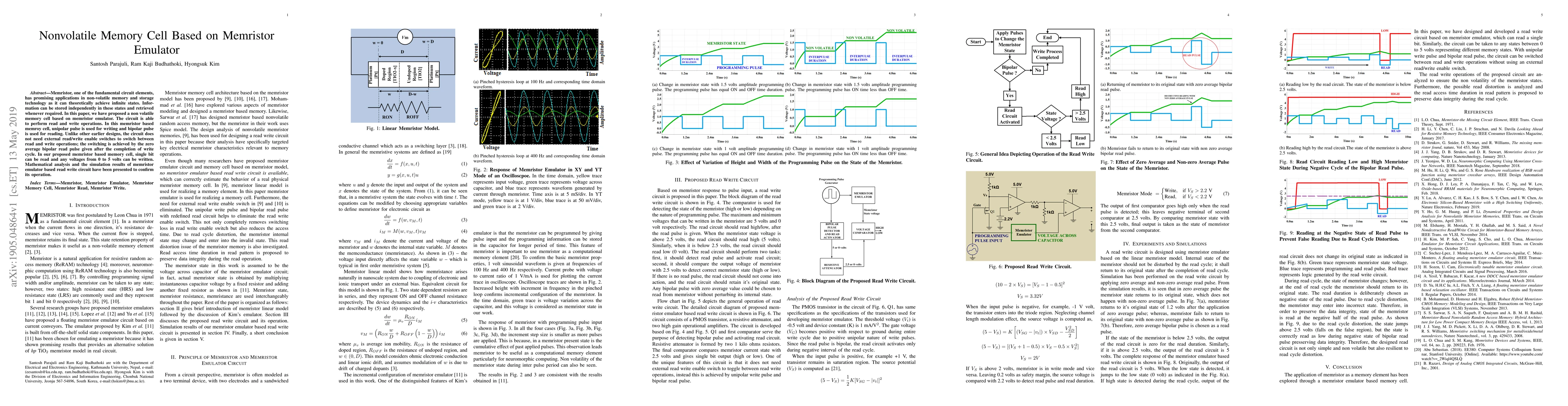 Memristor, one of the fundamental circuit elements, has promising applications in non-volatile memory and storage technology as it can theoretically achieve infinite states. Information can be stored independently in these states and retrieved whenever required. In this paper, we have proposed a non volatile memory cell based on memristor emulator. The circuit is able to perform read and write operations. In this memristor based memroy cell, unipolar pulse is used for writing and bipolar pulse is used for reading. Unlike other earlier designs, the circuit does not need external read/write enable switches to switch between read and write operations; the switching is achieved by the zero average bipolar read pulse given after the completion of write cycle. In our proposed memristor based memory cell, single bit can be read and any voltages from 0 to 5 volts can be written. Mathematical analysis and the simulation results of memristor emulator based read write circuit have been presented to confirm its operation.