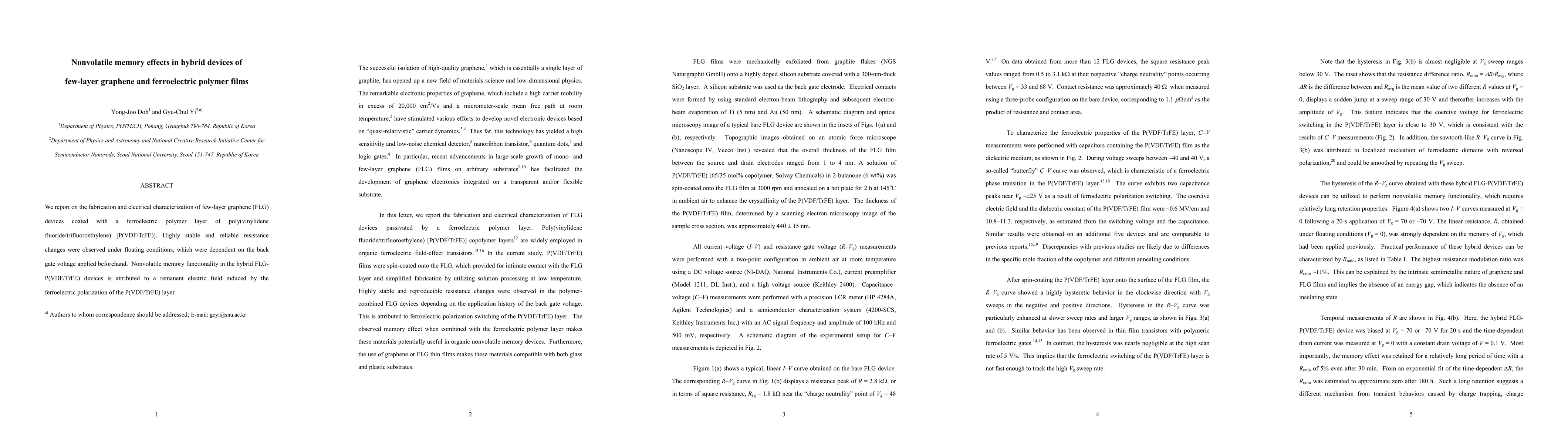 Summary: This paper presents hybrid devices combining few-layer graphene with ferroelectric polymer films, demonstrating nonvolatile memory effects due to stable resistance changes influenced by prior back gate voltage, attributed to the remanent electric field from the polymer’s ferroelectric polarization.