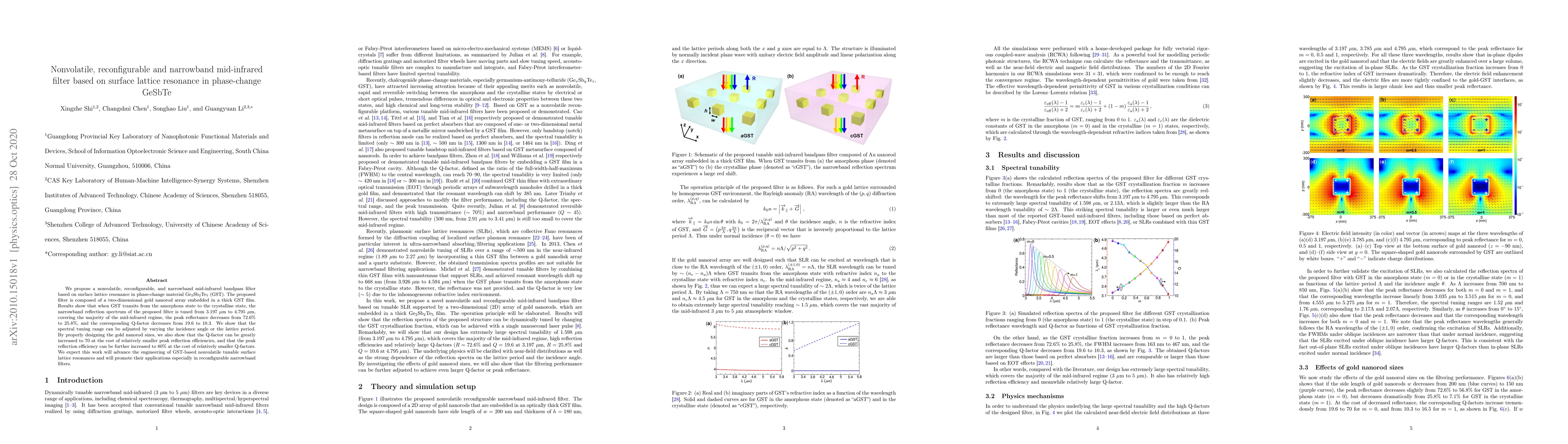 This paper proposes a nonvolatile, reconfigurable, and narrowband mid-infrared filter utilizing surface lattice resonance in phase-change material Ge2Sb2Te5. The filter, composed of a gold nanorod array in GST, tunes its reflection spectrum from 3.197 μm to 4.795 μm upon state transition, demonstrating potential for advanced tunable filter applications.