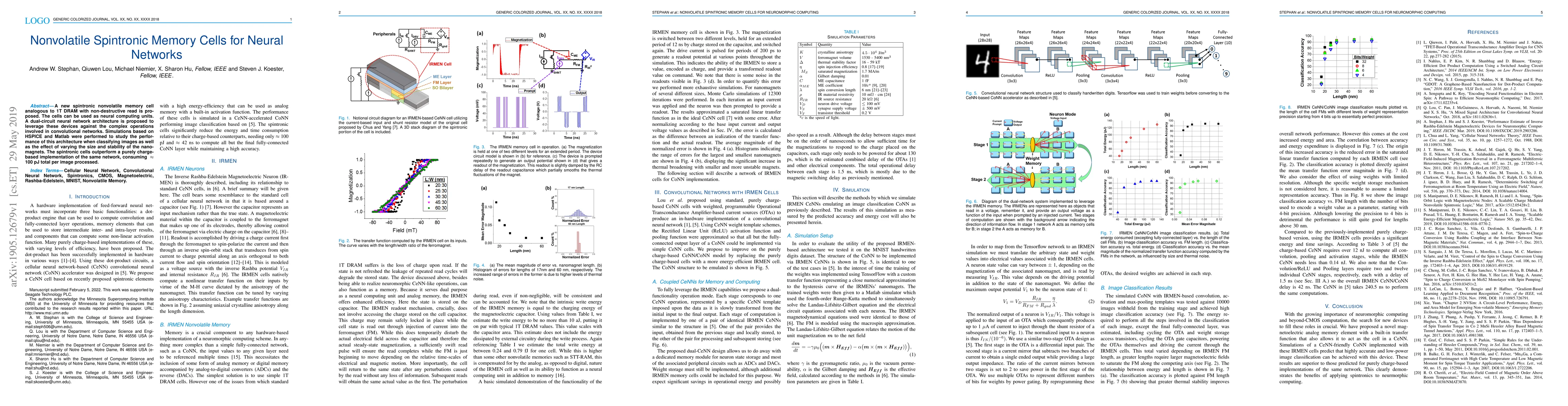 A new spintronic nonvolatile memory cell analogous to 1T DRAM with non-destructive read is proposed. The cells can be used as neural computing units. A dual-circuit neural network architecture is proposed to leverage these devices against the complex operations involved in convolutional networks. Simulations based on HSPICE and Matlab were performed to study the performance of this architecture when classifying images as well as the effect of varying the size and stability of the nanomagnets. The spintronic cells outperform a purely charge-based implementation of the same network, consuming about 100 pJ total per image processed.