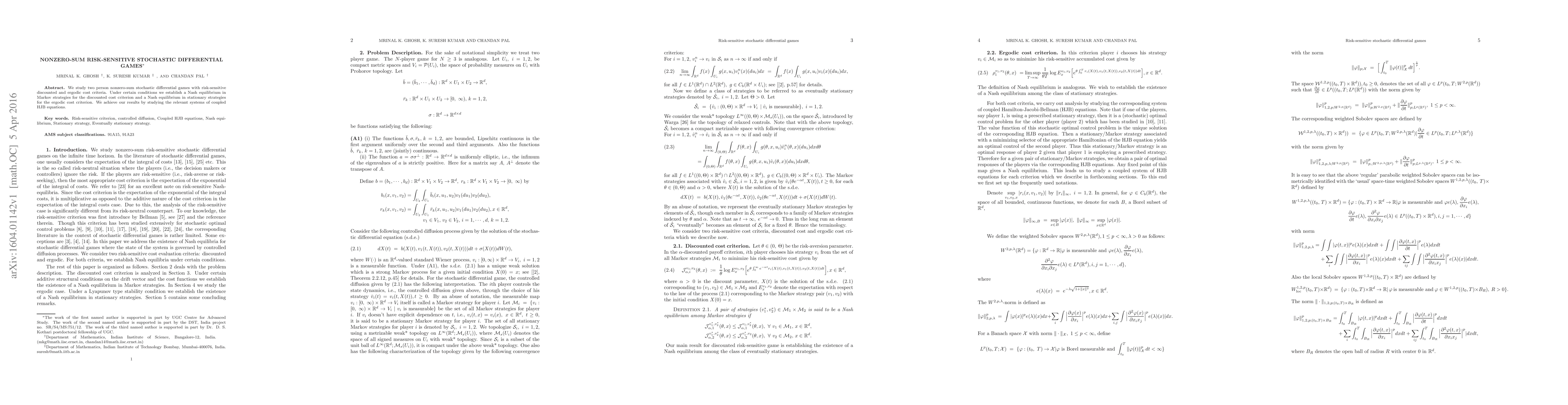 This paper investigates two-player nonzero-sum stochastic differential games with risk-sensitive cost criteria, establishing Nash equilibria in Markov and stationary strategies for discounted and ergodic costs, respectively, through analysis of coupled Hamilton-Jacobi-Bellman (HJB) equations.