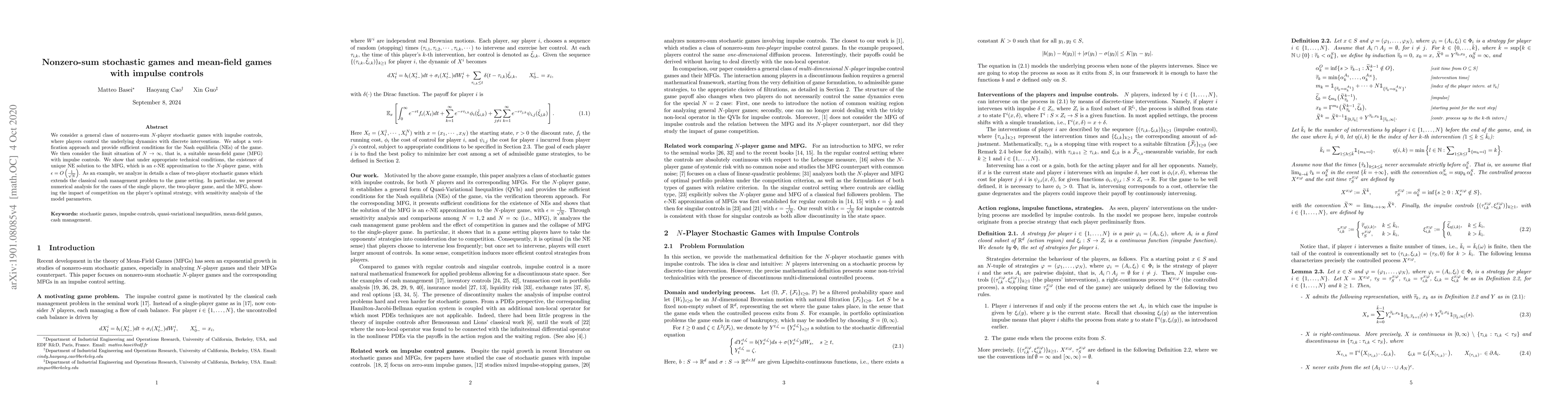 We consider a general class of nonzero-sum $N$-player stochastic games with impulse controls, where players control the underlying dynamics with discrete interventions. We adopt a verification approach and provide sufficient conditions for the Nash equilibria (NEs) of the game. We then consider the limit situation of $N \to \infty$, that is, a suitable mean-field game (MFG) with impulse controls. We show that under appropriate technical conditions, the existence of unique NE solution to the MFG, which is an $\epsilon$-NE approximation to the $N$-player game, with $\epsilon=O\left(\frac{1}{\sqrt{N}}\right)$. As an example, we analyze in details a class of two-player stochastic games which extends the classical cash management problem to the game setting. In particular, we present numerical analysis for the cases of the single player, the two-player game, and the MFG, showing the impact of competition on the player's optimal strategy, with sensitivity analysis of the model parameters.