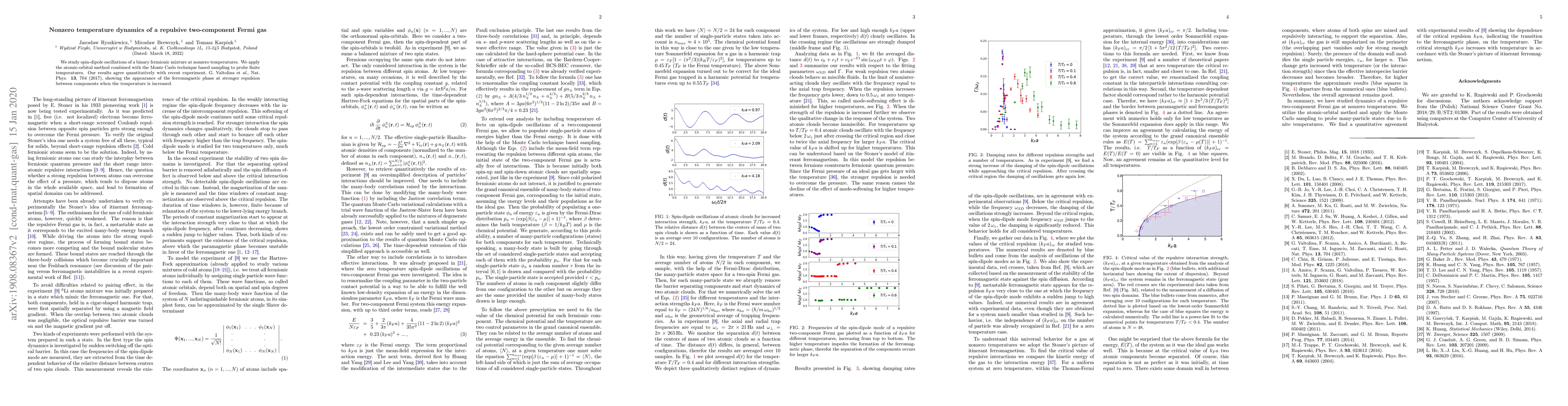 This research investigates the behavior of a two-component fermionic gas at nonzero temperatures, focusing on spin-dipole oscillations. Utilizing the atomic-orbital method with Monte Carlo sampling, the study confirms experimental findings (Valtolina et al., Nat. Phys. 13, 704, 2017) revealing a transition to a ferromagnetic phase in stronger repulsive interactions as temperature rises.