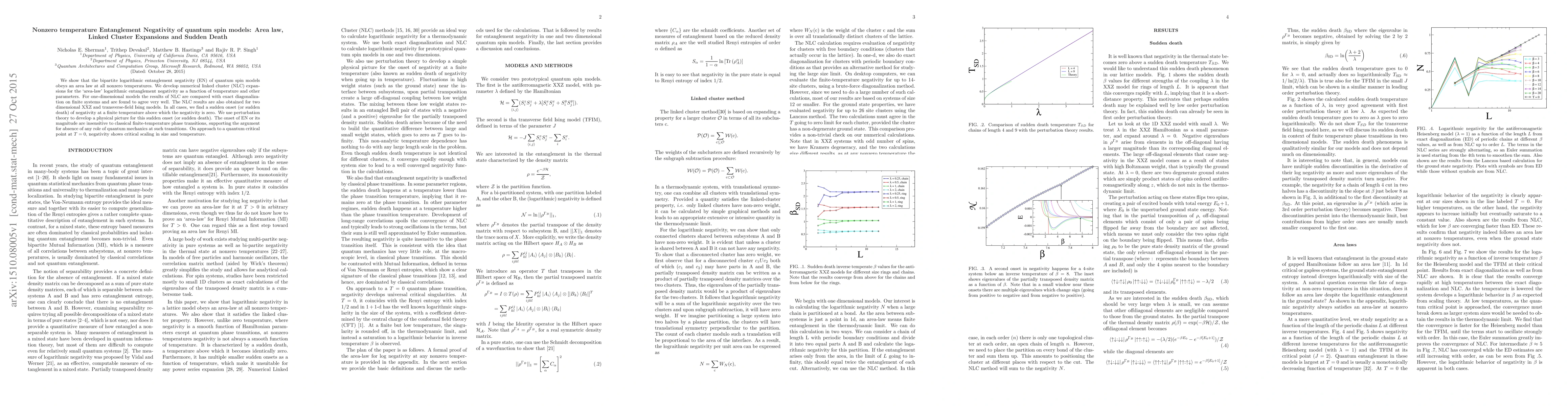 This paper demonstrates that the bipartite logarithmic entanglement negativity (EN) in quantum spin models follows an area law at all nonzero temperatures. It introduces numerical linked cluster expansions to study the temperature dependence of EN, showing agreement with exact diagonalization in one-dimensional models and results for two-dimensional systems. The study reveals a sudden disappearance of negativity at a finite temperature, termed "sudden death," and argues that this phenomenon is not influenced by classical phase transitions.