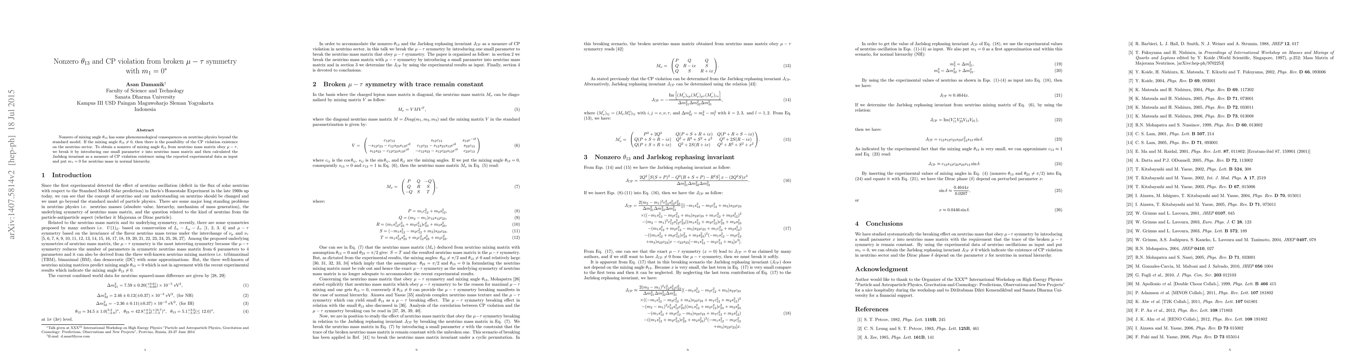 This paper investigates the nonzero mixing angle $\theta_{13}$ and its implications for CP violation in neutrino physics, leveraging broken $\mu-\tau$ symmetry and setting $m_{1}=0$ in the neutrino mass matrix. It introduces a small parameter to break $\mu-\tau$ symmetry and uses Jarlskog invariant to measure CP violation based on experimental data.