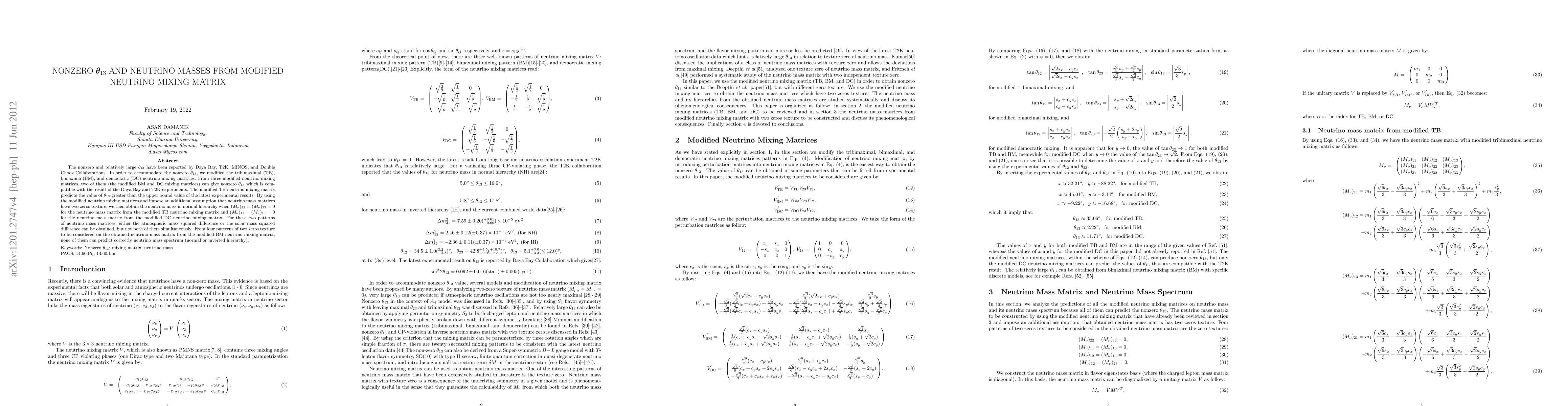 This paper modifies tribimaximal, bimaxima, and democratic neutrino mixing matrices to accommodate the nonzero $\theta_{13}$ angle observed in experiments. The modified bimaxima and democratic matrices can yield $\theta_{13}$ values consistent with experimental results, while the modified tribimaximal matrix exceeds current experimental bounds. The study also explores neutrino mass matrices with two zero textures, finding that only certain patterns can predict normal hierarchy masses.