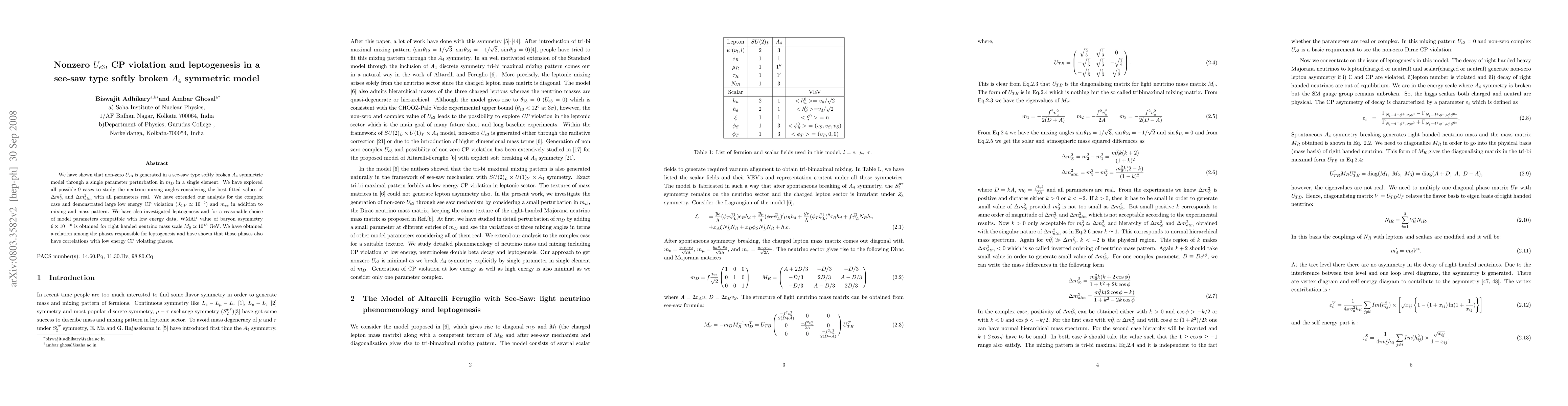 This paper explores a see-saw type softly broken A_4 symmetric model generating non-zero U_{e3} and large CP violation, while achieving leptogenesis compatible with observed baryon asymmetry and right-handed neutrino mass scale. The study correlates low energy CP violating phases with those responsible for leptogenesis.