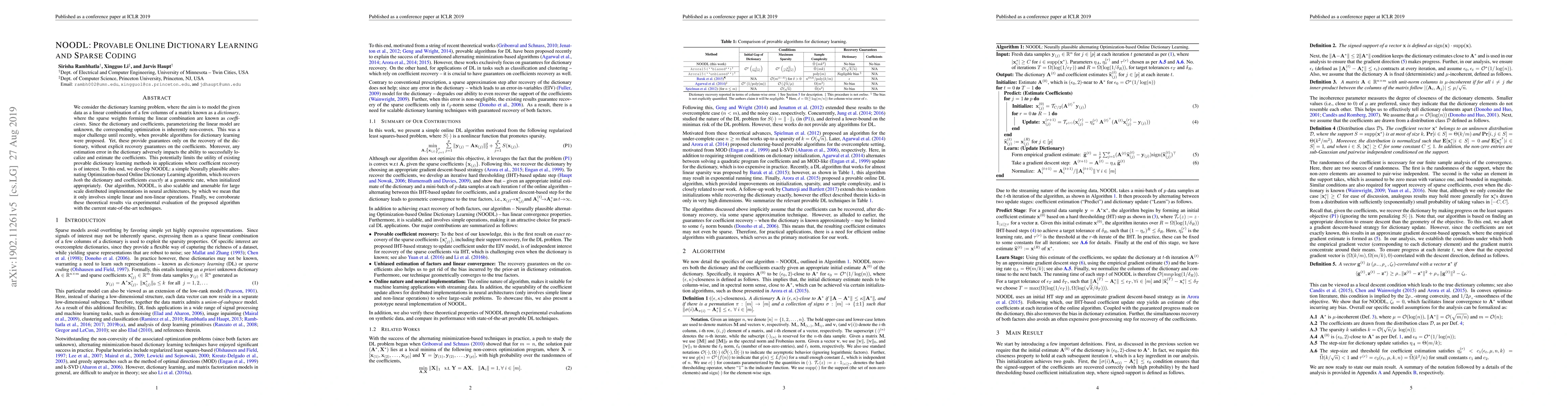 NOODL is a novel algorithm for online dictionary learning that provides provable guarantees for both dictionary and coefficient recovery, leveraging neurally plausible optimization techniques. It is scalable and suitable for large-scale distributed implementations, validated through comparative experiments with state-of-the-art methods.