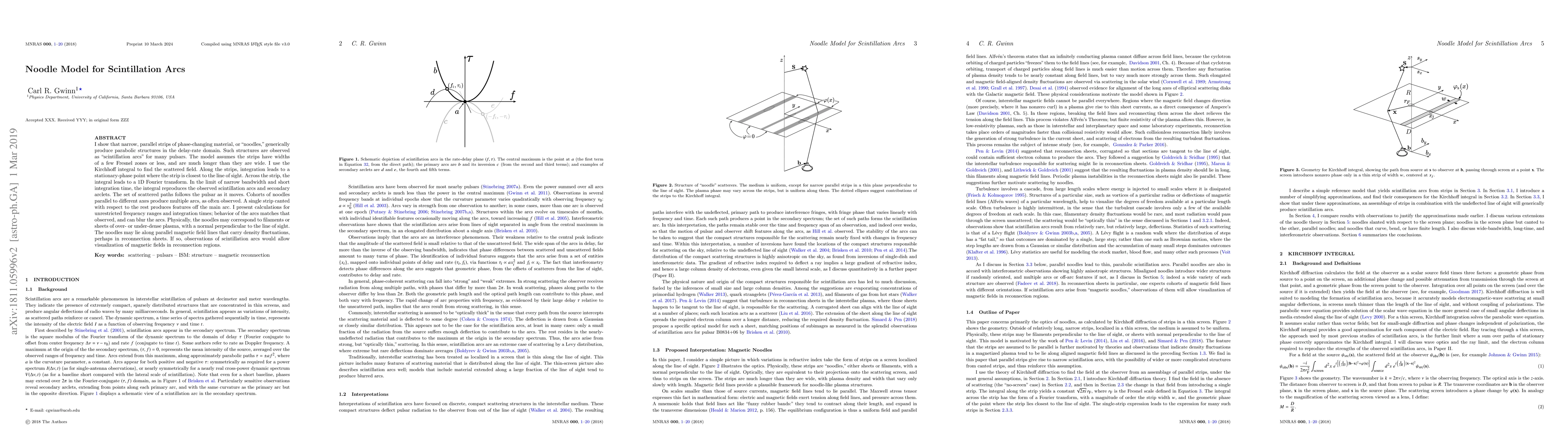 I show that narrow, parallel strips of phase-changing material, or "noodles," generically produce parabolic structures in the delay-rate domain. Such structures are observed as "scintillation arcs" for many pulsars. The model assumes the strips have widths of a few Fresnel zones or less, and are much longer than they are wide. I use the Kirchhoff integral to find the scattered field. Along the strips, integration leads to a stationary-phase point where the strip is closest to the line of sight. Across the strip, the integral leads to a 1D Fourier transform. In the limit of narrow bandwidth and short integration time, the integral reproduces the observed scintillation arcs and secondary arclets. The set of scattered paths follows the pulsar as it moves. Cohorts of noodles parallel to different axes produce multiple arcs, as often observed. A single strip canted with respect to the rest produces features off the main arc. I present calculations for unrestricted frequency ranges and integration times; behavior of the arcs matches that observed, and can blur the arcs. Physically, the noodles may correspond to filaments or sheets of over- or under-dense plasma, with a normal perpendicular to the line of sight. The noodles may lie along parallel magnetic field lines that carry density fluctuations, perhaps in reconnection sheets. If so, observations of scintillation arcs would allow visualization of magnetic fields in reconnection regions.
