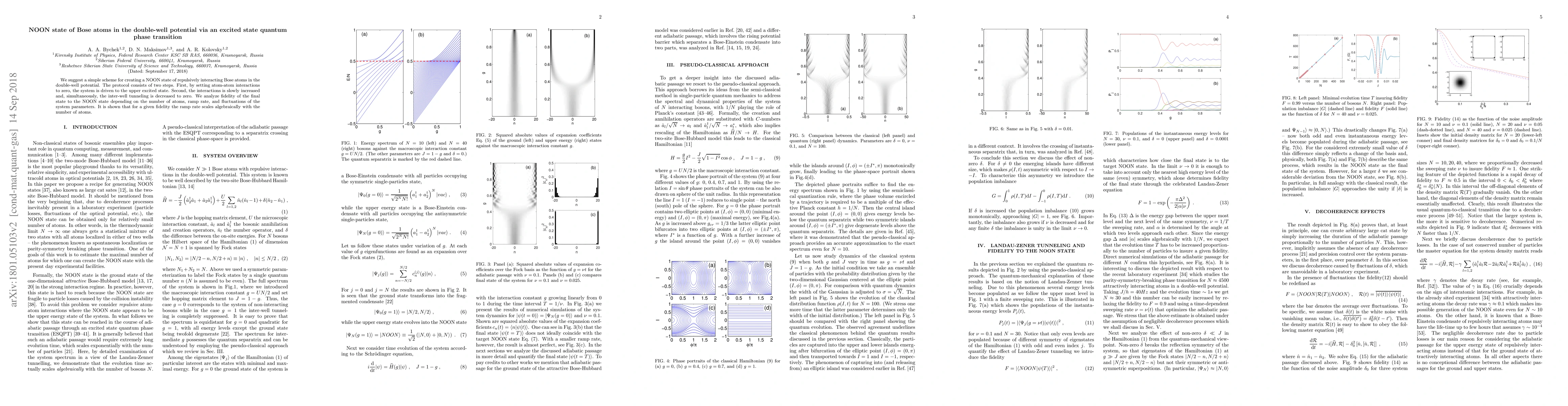 We suggest a simple scheme for creating a NOON state of repulsively interacting Bose atoms in the double-well potential. The protocol consists of two steps. First, by setting atom-atom interactions to zero, the system is driven to the upper excited state. Second, the interactions is slowly increased and, simultaneously, the inter-well tunneling is decreased to zero. We analyze fidelity of the final state to the NOON state depending on the number of atoms, ramp rate, and fluctuations of the system parameters. It is shown that for a given fidelity the ramp rate scales algebraically with the number of atoms.