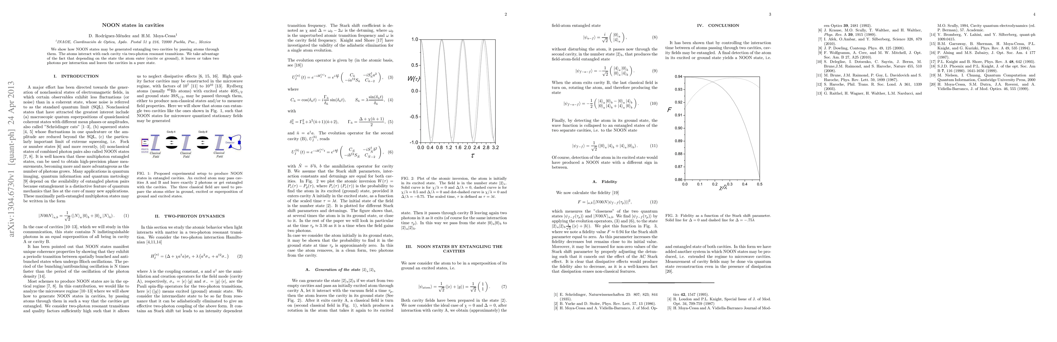 Summary: This paper demonstrates the generation of NOON states by entangling two cavities using atoms that interact via two-photon resonant transitions, resulting in the cavities being left in a pure state depending on the atom's initial state.