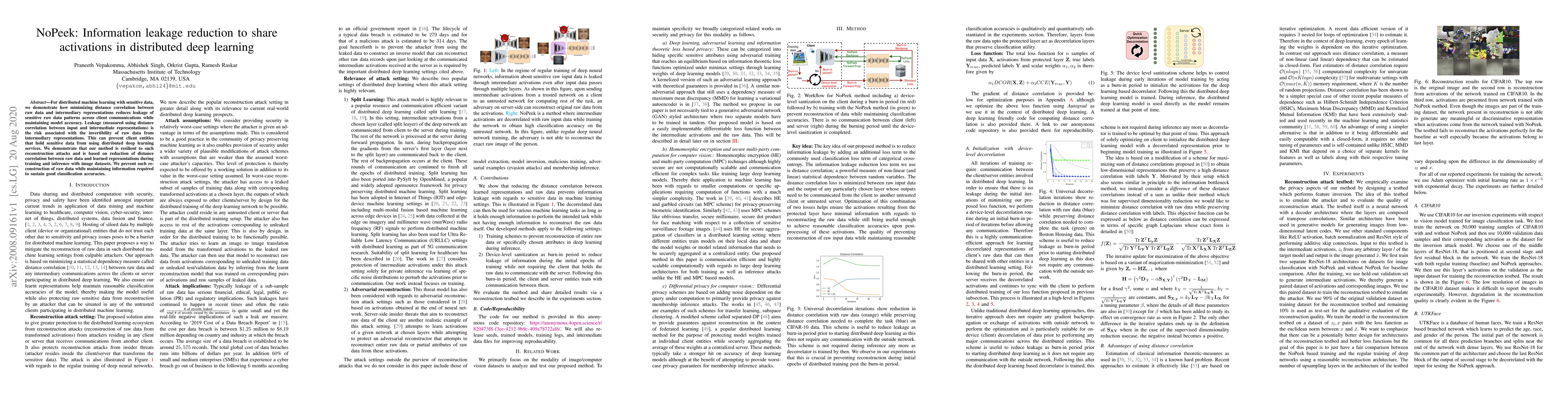 The paper "NoPeek" proposes a method to minimize information leakage in distributed deep learning by reducing the distance correlation between raw data and intermediary representations, thus preventing the reconstruction of sensitive data while maintaining model accuracy. This approach enhances privacy for clients holding sensitive data by resisting reconstruction attacks.