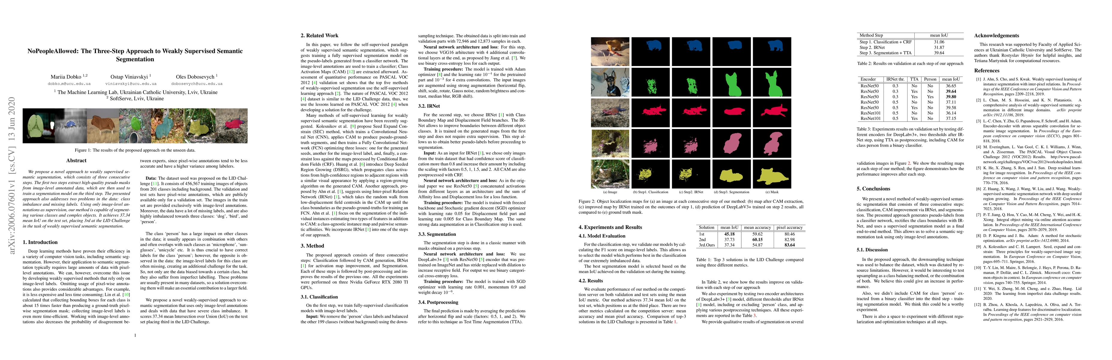 A new approach to weakly supervised semantic segmentation achieves 37.34 mean IoU using only image-level annotations, outperforming others in the LID Challenge.